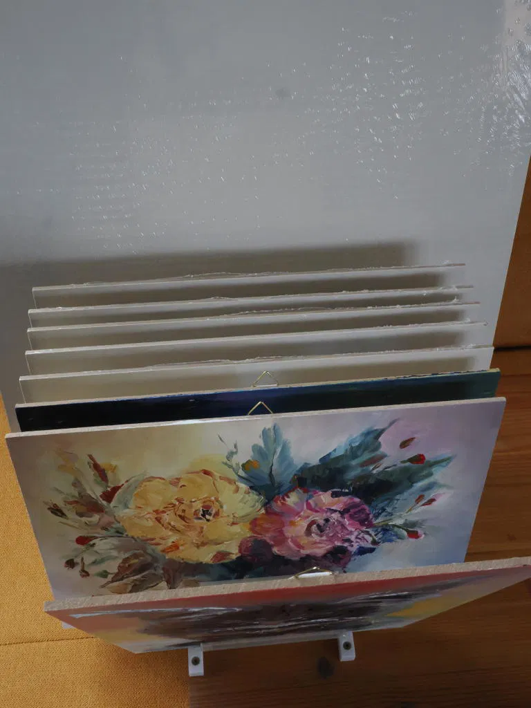 Cái giá đỡ này dùng để trưng bày tranh trên các tấm painting plate hoặc ảnh dán trên bìa cứng. Mình có thể lật xem từng tấm. Tổng cộng có thể cắm 9 tấm vào các ngàm giữ. Thường thì các tấm sẽ không chạm vào nhau.