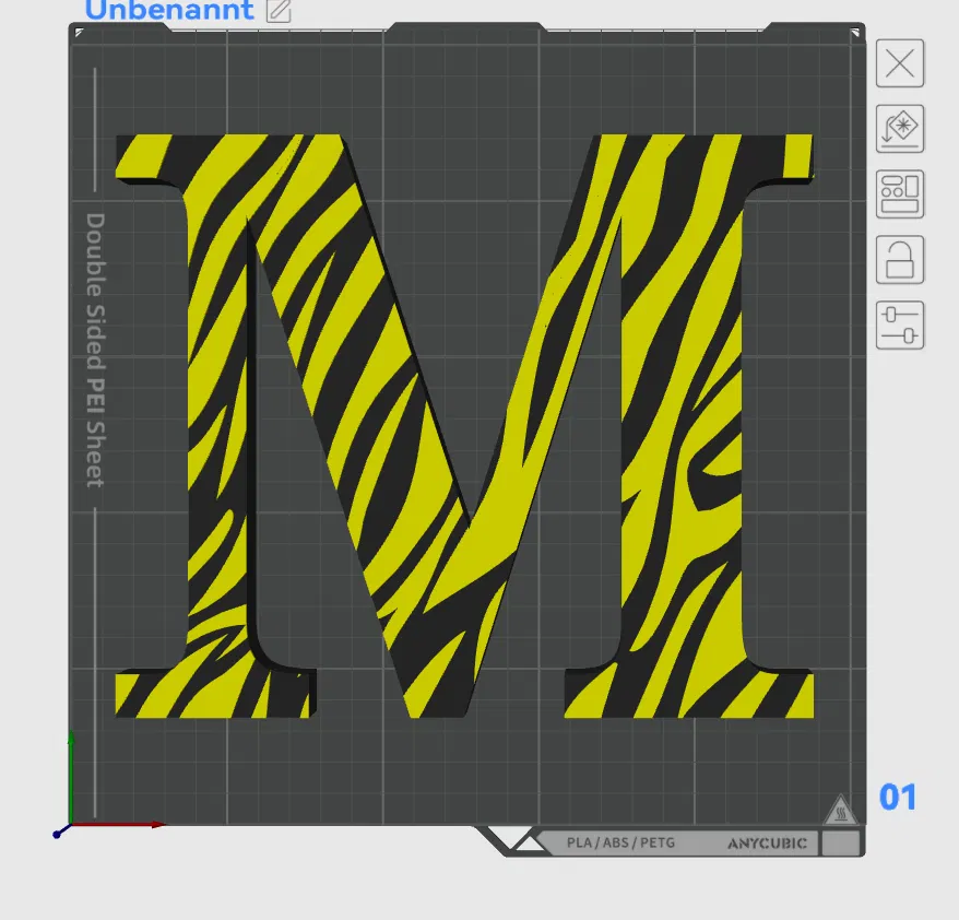 Mẫu 3D chữ cái “M” với họa tiết vân ngựa vằn (zebra design). Phù hợp để in 3D làm trang trí, bảng tên, hoặc ghép thành bộ chữ theo phong cách nổi bật, dễ nhận diện.