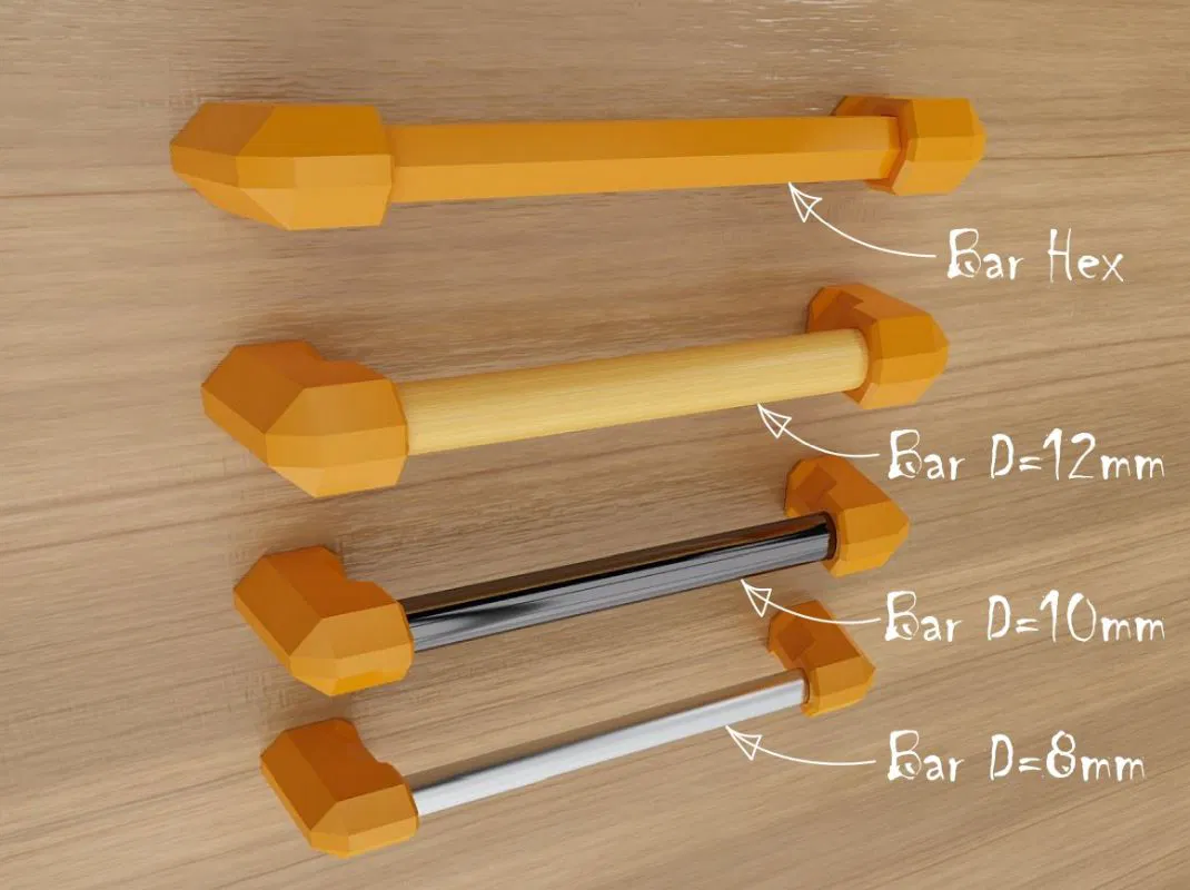 Tay nắm gồm các miếng kẹp (cleat) và một thanh (bar). Thanh dạng lục giác (Hex) có thể in trên máy in 3D, hoặc bạn dùng bất kỳ ống/thanh nào (gỗ, nhôm, nhựa, chrome, đồng...) với đường kính 8, 10 hoặc 12 mm. Chiều dài của thanh sẽ quyết định chiều dài tay nắm (xem hình). Nếu bạn muốn tay nắm dài (khoảng 400+ mm) thì có thể dùng miếng kẹp giữa (Mid). Hoặc dùng nhiều miếng Mid để làm tay nắm rất dài. Miếng kẹp L+R là đối xứng, dùng được cho cả bên trái hoặc bên phải.