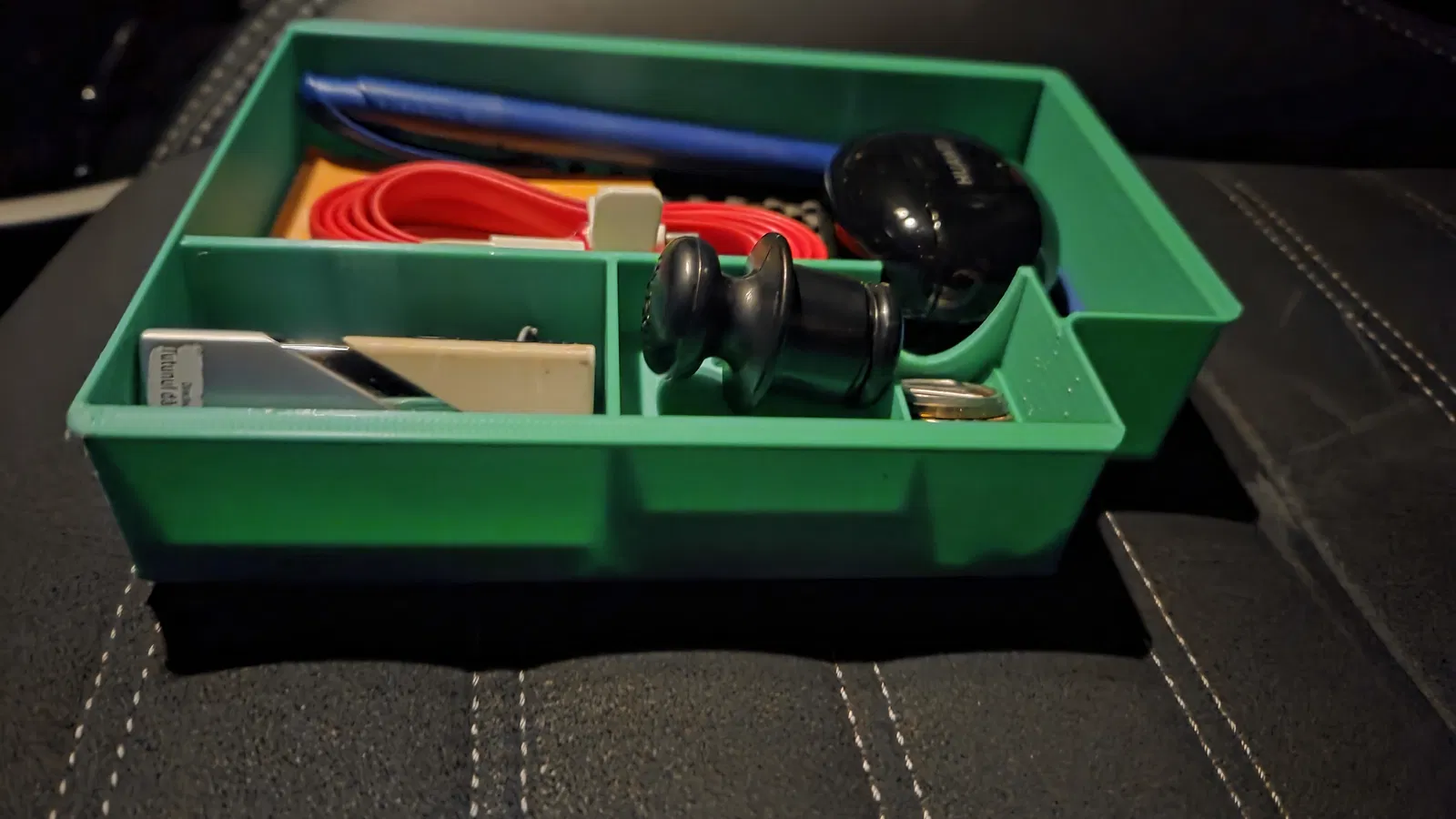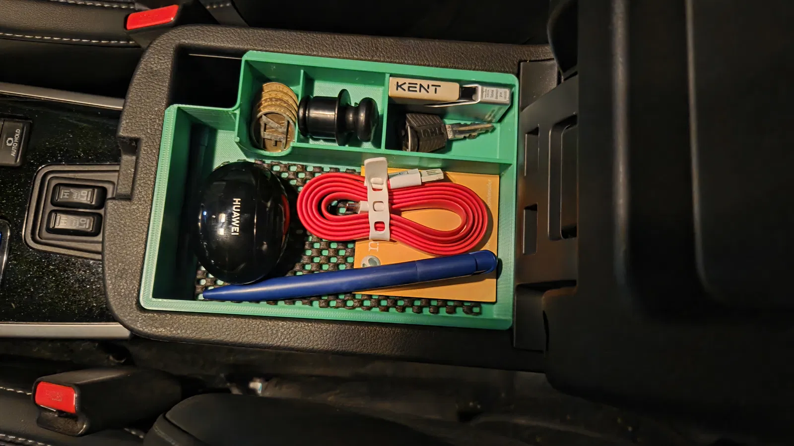 Mình thiết kế cái insert cho hộc tỳ tay này để giúp bên trong gọn gàng hơn. Kích thước hộp là 120 x 167 mm và phần brim là 128 x 171 mm. Bạn có thể tăng kích thước brim thêm khoảng 6mm xung quanh (3mm mỗi bên) nếu muốn fit khít hơn. Ngăn chính được tối ưu để vừa Samsung S25 có ốp, ngăn đựng xu nên vừa xu 0,50€ và còn có một ngăn ẩn cho Samsung Smart Tag để hỗ trợ theo dõi xe nếu lỡ bị trộm; ngăn này cũng sẽ vừa Apple AirTag nếu bạn đang dùng loại đó.