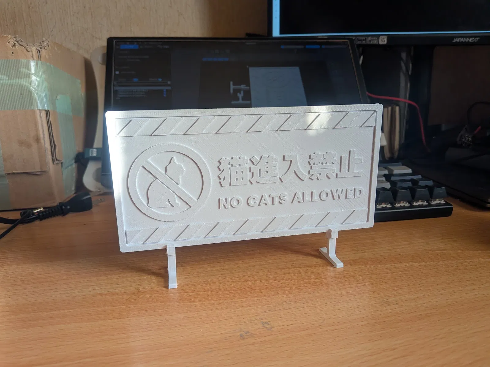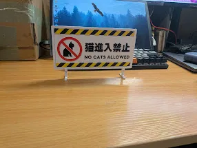 Biển báo giúp thông báo rõ ràng khu vực không cho mèo vào, phù hợp đặt gần PC, máy in hoặc bồn hoa. Chân đế trái/phải dùng chung, chỉ cần in 2 cái và có thể tự sơn/tô màu theo ý.