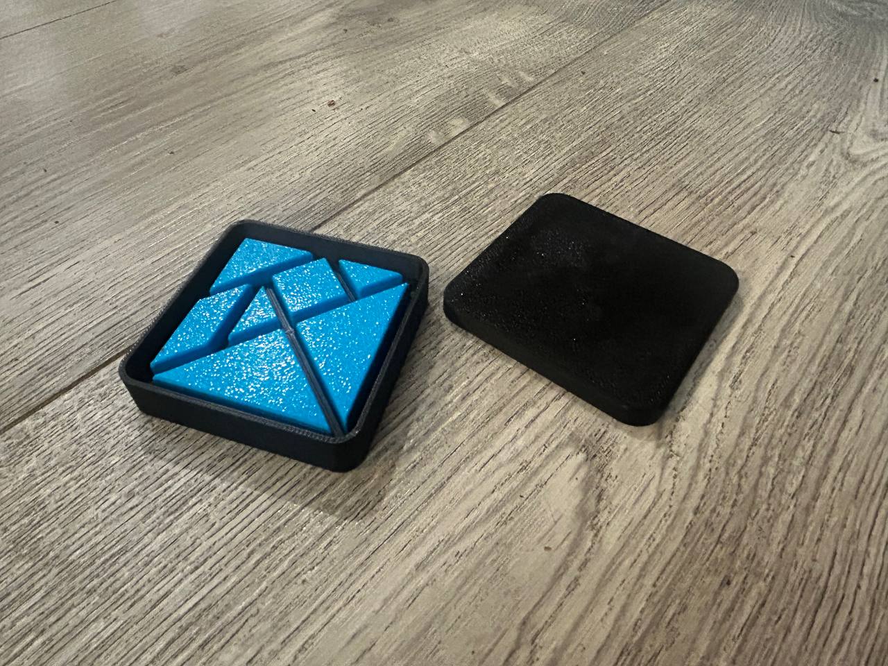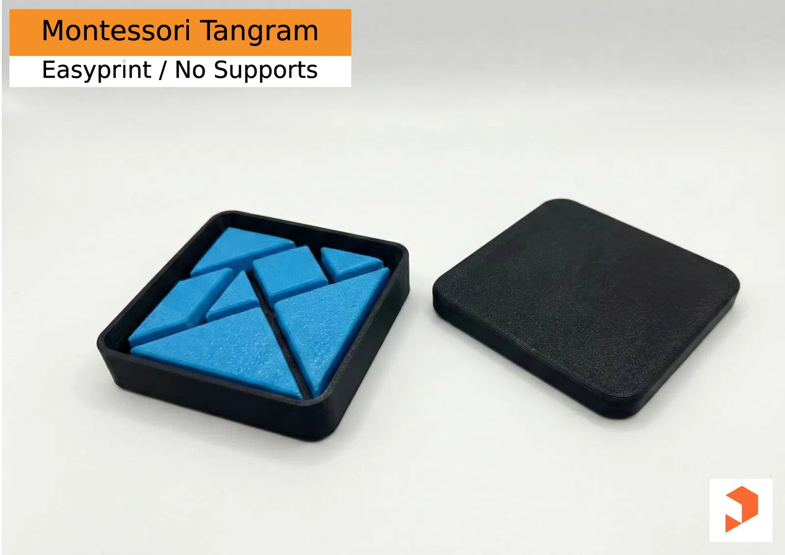 Mẫu Tangram Montessori đẹp mắt, gồm 7 mảnh “tans” hình học và khay hộp vuông để cất gọn. Cạnh được vát nhẹ cầm êm tay, dễ in 3D với PLA/PETG, không cần support; infill 10–15%, layer height 0.20mm.