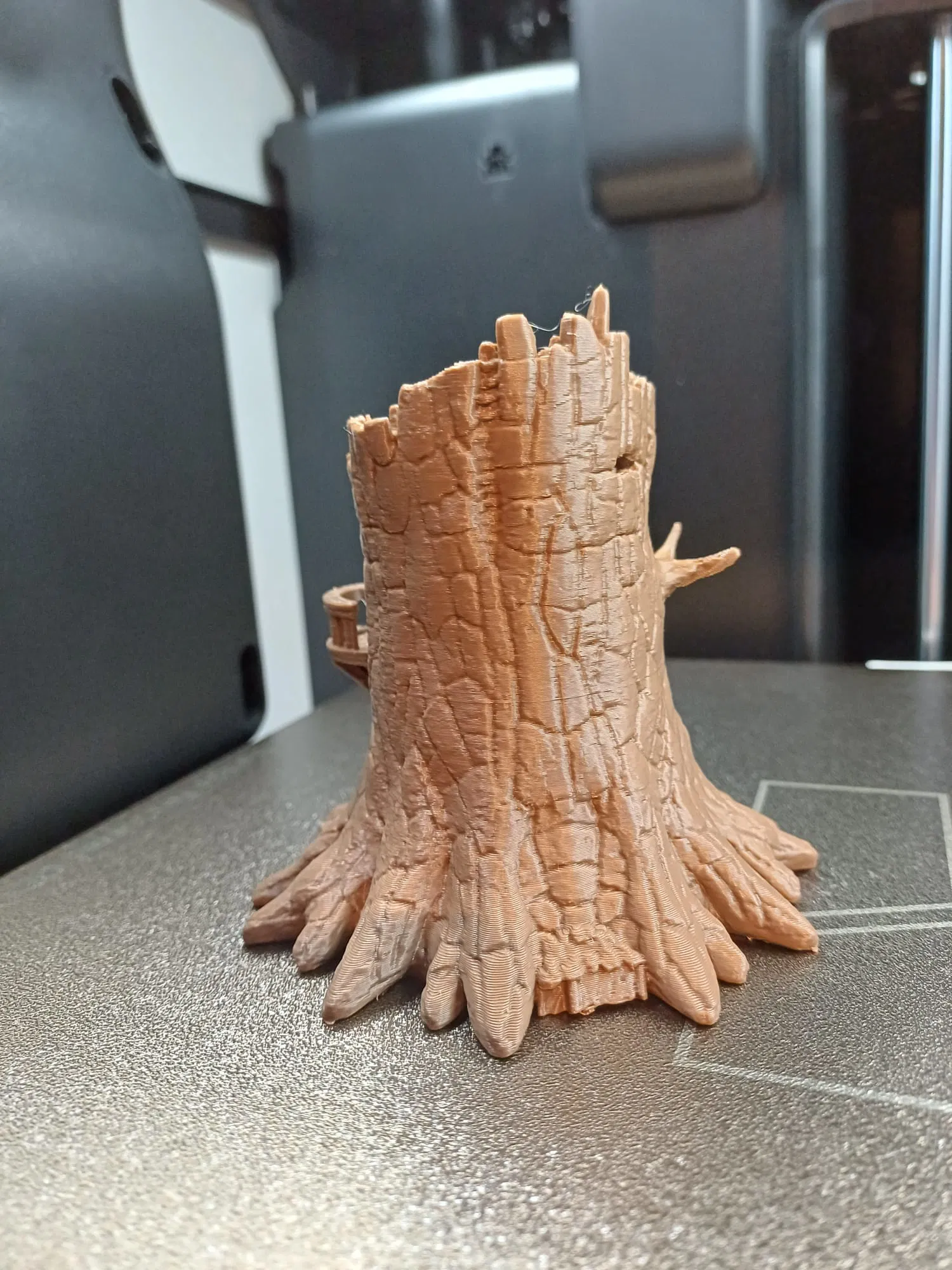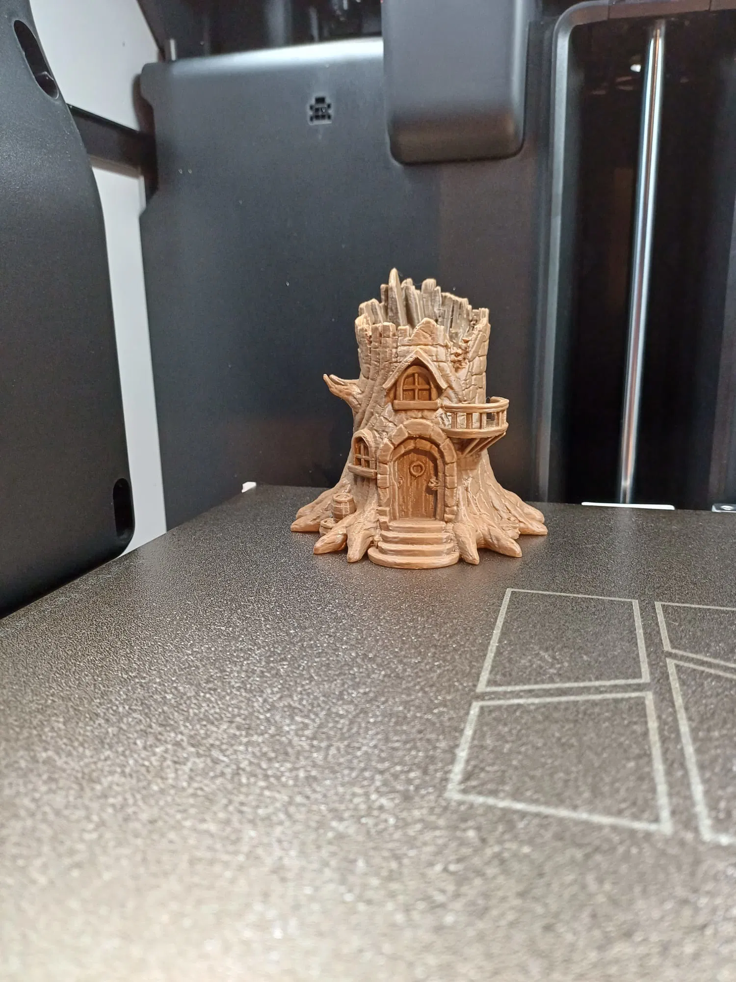 Mẫu Fantasy Tree Stump House là căn nhà nhỏ ẩn trong gốc cây cổ thụ, nổi bật với vân vỏ cây chi tiết, cửa gỗ có bậc thang, cửa sổ nhỏ và ban công cong ôm quanh thân—hợp trưng bày, tabletop, diorama.