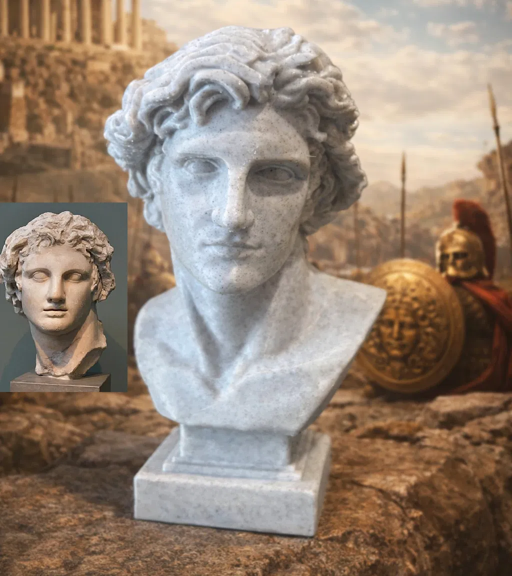 Bức tượng bán thân này khắc họa Alexander Đại Đế, một trong những nhà chinh phục có tầm ảnh hưởng lớn nhất lịch sử cổ đại—Vua Macedon và nhà chỉ huy quân sự có tầm nhìn, với đế chế trải dài từ Hy Lạp đến tận biên giới Ấn Độ. Lấy cảm hứng từ những hình tượng lịch sử được công nhận rộng rãi nhất về nhân vật này, bản diễn giải điêu khắc tuân theo hệ iconography cổ điển vốn thường gắn với Alexander.