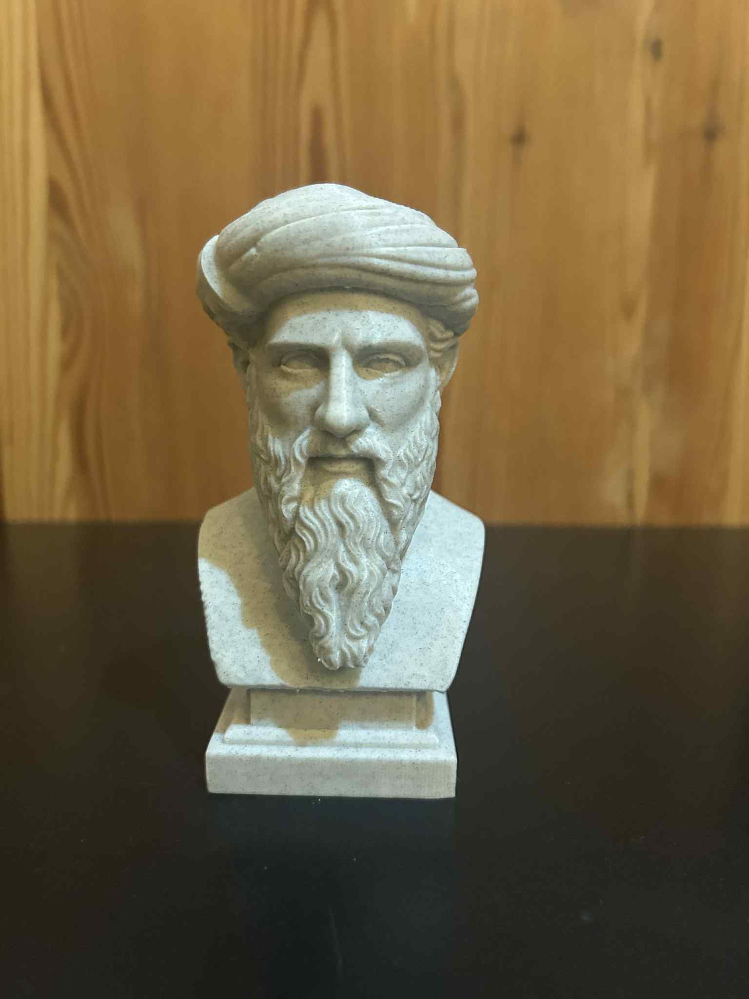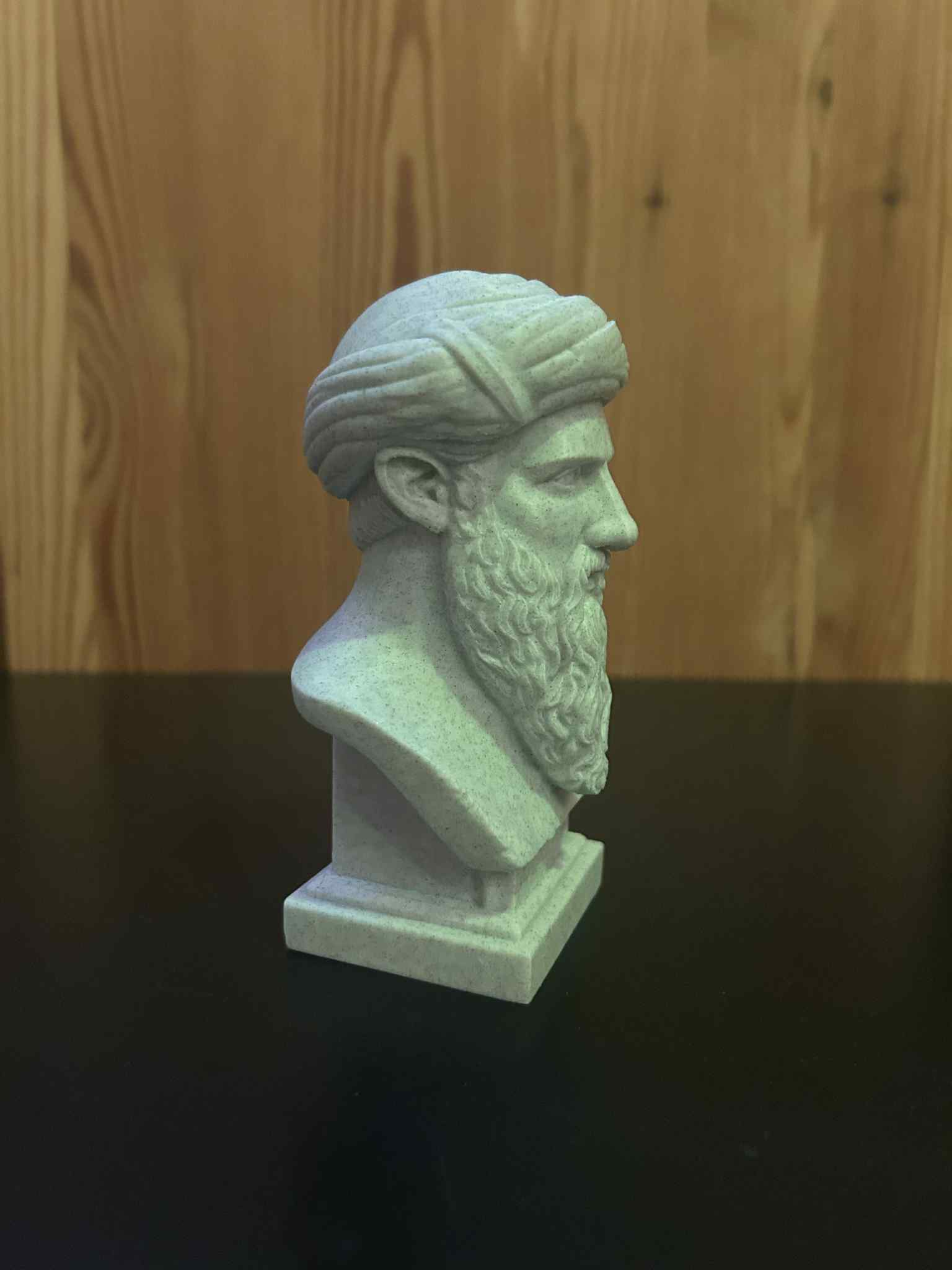 Mẫu tượng bán thân in 3D khắc họa Pythagore (Pythagoras of Samos) theo iconography cổ điển. Gương mặt nghiêm trang, râu và đường nét mạnh mẽ gợi hình ảnh triết gia–nhà toán học, tôn vinh định lý và tư tưởng về trật tự vũ trụ.
