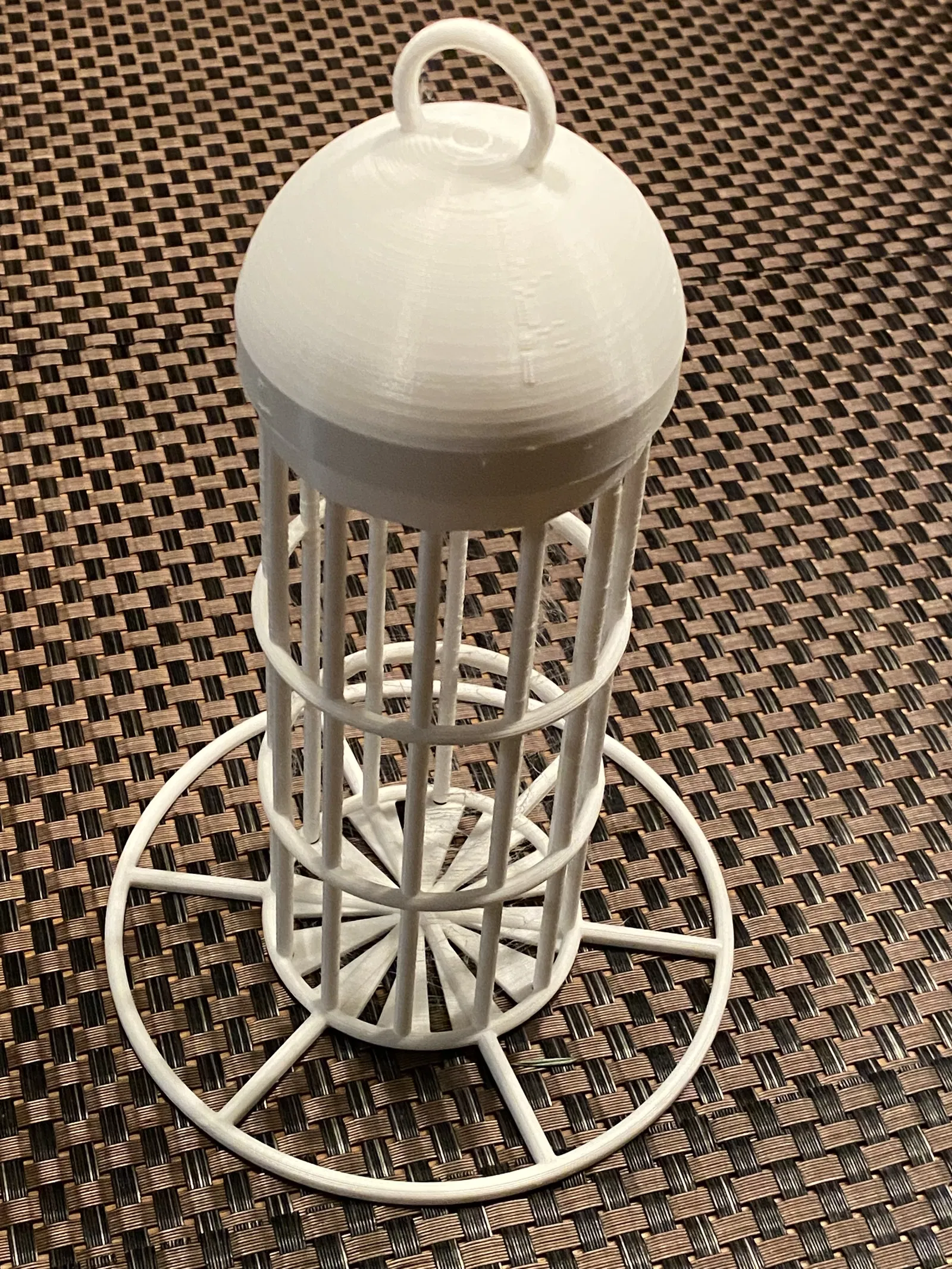 Mấy viên mỡ cho chim (fat balls) giờ bán không có lưới (đúng rồi, khỏi thành rác) – nhưng vậy thì bạn cần một cái lồng/khung để treo cho chim ăn. Mình có thử dùng mẫu trên Thingiverse ở link dưới, nhưng in gặp vài vấn đề.