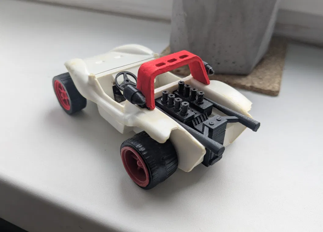 Bộ chi tiết thay thế cho xe buggy đồ chơi IGRA Bugina: motor, khung có đèn, vô lăng, mâm trước và lốp, cần lên cót. Motor chia 2 phần để dễ in/ráp; khung chỉnh để đặt phẳng lên bed.