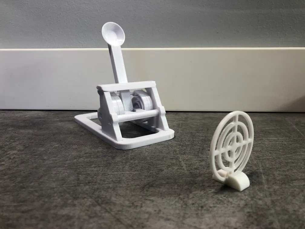 - Cánh tay và giá đỡ cánh tay được gộp thành một chi tiết (Catapult_Arm.stl) để dễ sắp xếp trên bàn in. Hai phần được nối bằng một micro-thanh ở giữa trục, khi xoay khớp thì thanh này sẽ tự gãy; nhờ vậy hai phần luôn canh thẳng đúng vị trí đối diện nhau