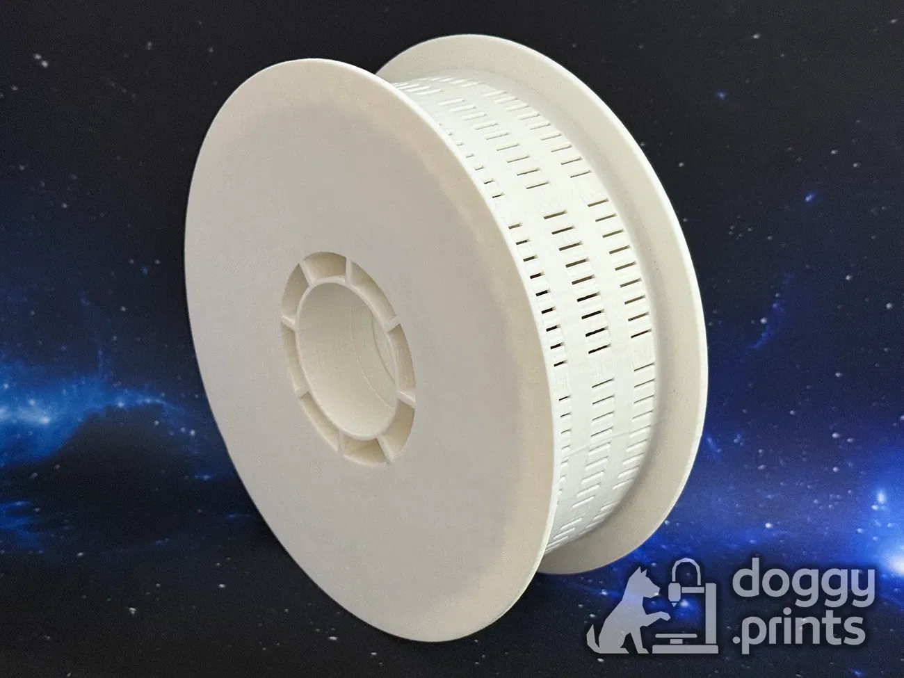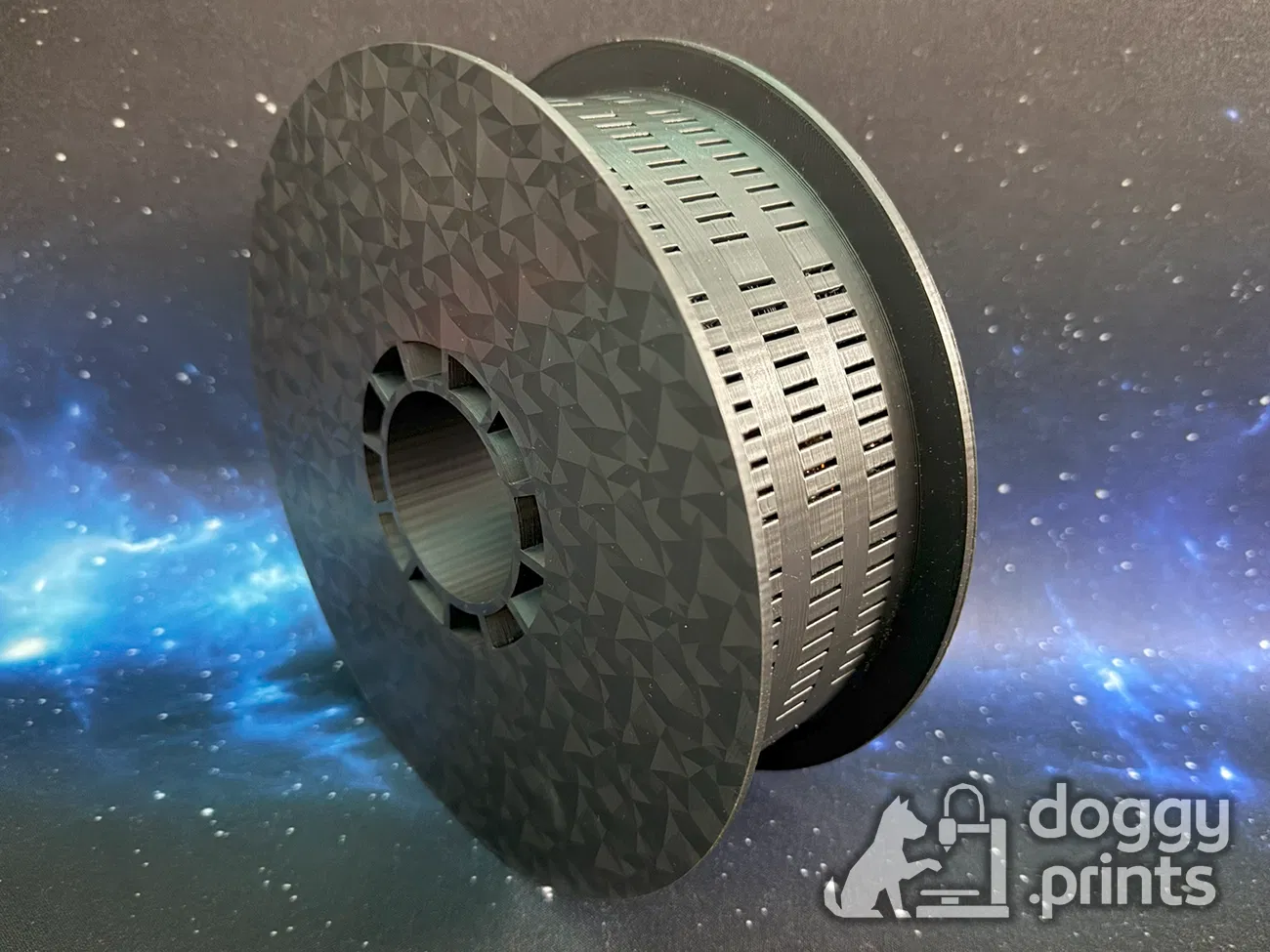 Spool được in làm 2 phần và ráp lại bằng kiểu friction fit chắc chắn. Vành có rãnh giúp hạt silica không bị lọt ra ngoài. Đường kính ngoài và trong theo chuẩn nên tương thích với đa số máy sấy filament và giá treo spool.