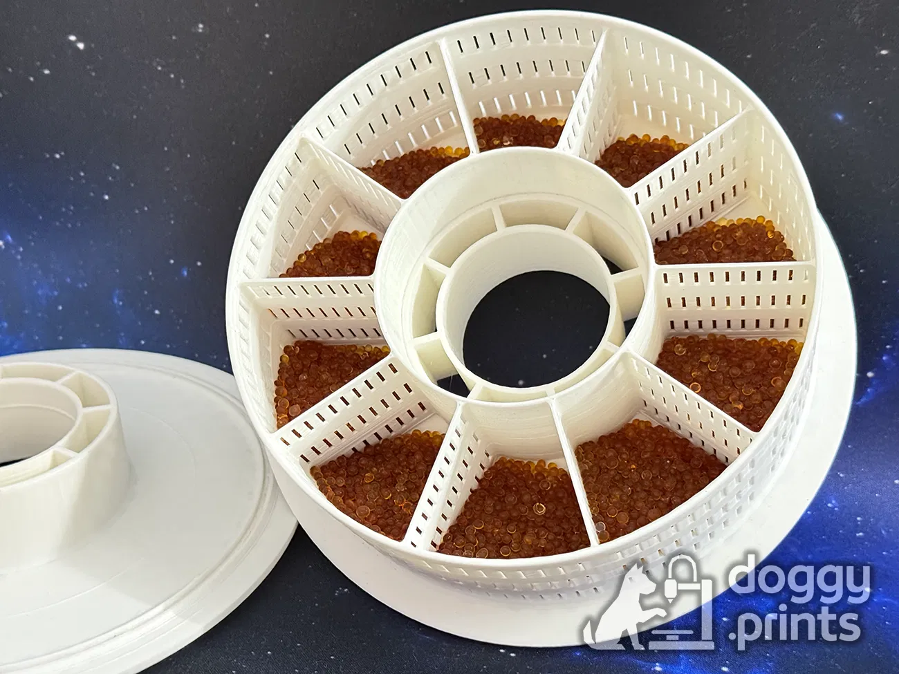 Chỉ cần đổ hạt silica vào spool, đặt vào máy sấy, rồi để luồng khí lưu thông làm phần còn lại. Bạn cũng có thể nhét các túi silica vào các ngăn của spool. Khi đã khô, bạn có thể để nguyên cả spool đã đổ đầy vào hộp lưu trữ filament — hoặc trút hạt trở lại hộp/chai silica gel bạn hay dùng để giữ các cuộn filament luôn khô ráo.