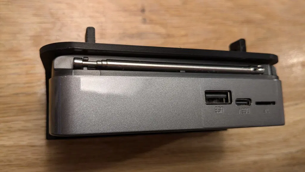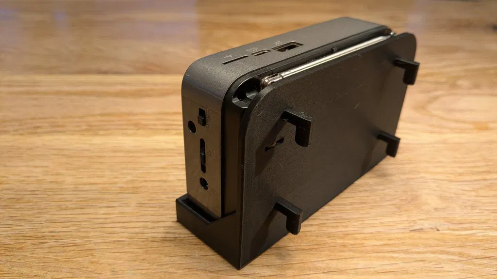 Cái ngàm/giá đỡ này giữ được chiếc radio và có ngàm kẹp để cài vào bảng tường Ikea Skadis.