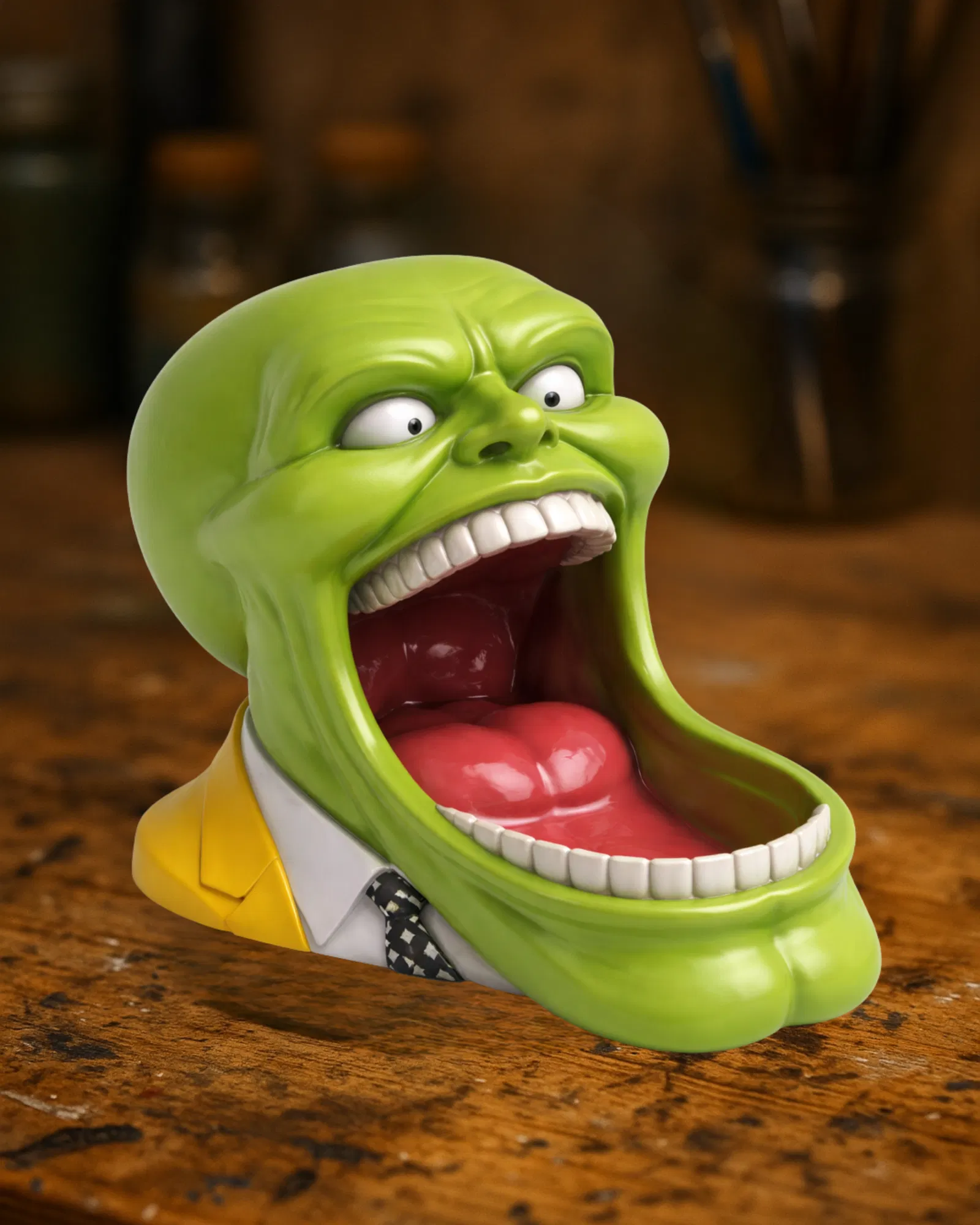 Một chiếc bát hình khuôn mặt màu xanh, lấy cảm hứng từ phong cách phóng đại mang tính biểu tượng của The Mask.