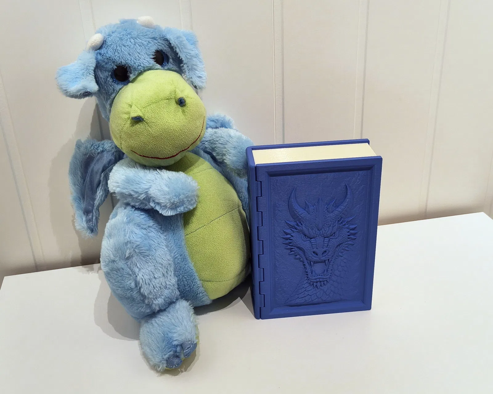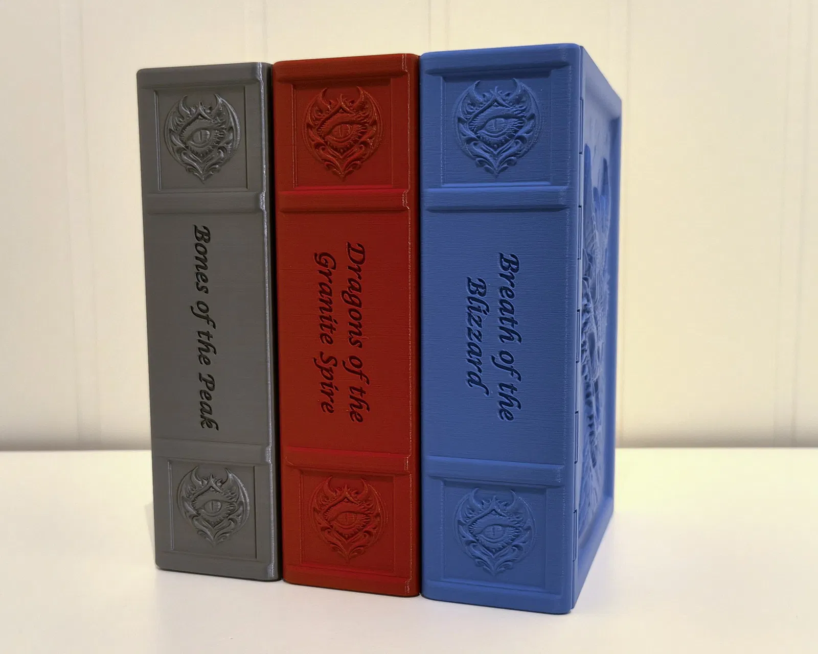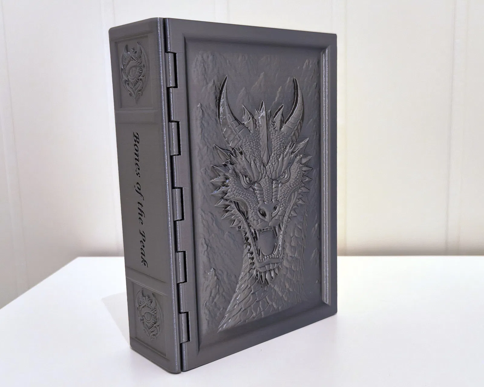 Hộp lưu trữ hình cuốn sách trang trí, dập nổi cảnh rồng giữa núi non và có ngăn giấu đồ bên trong. In 3D dễ: không cần supports, bản lề print-in-place, nắp đóng nam châm; hợp cất xúc xắc/token tabletop.