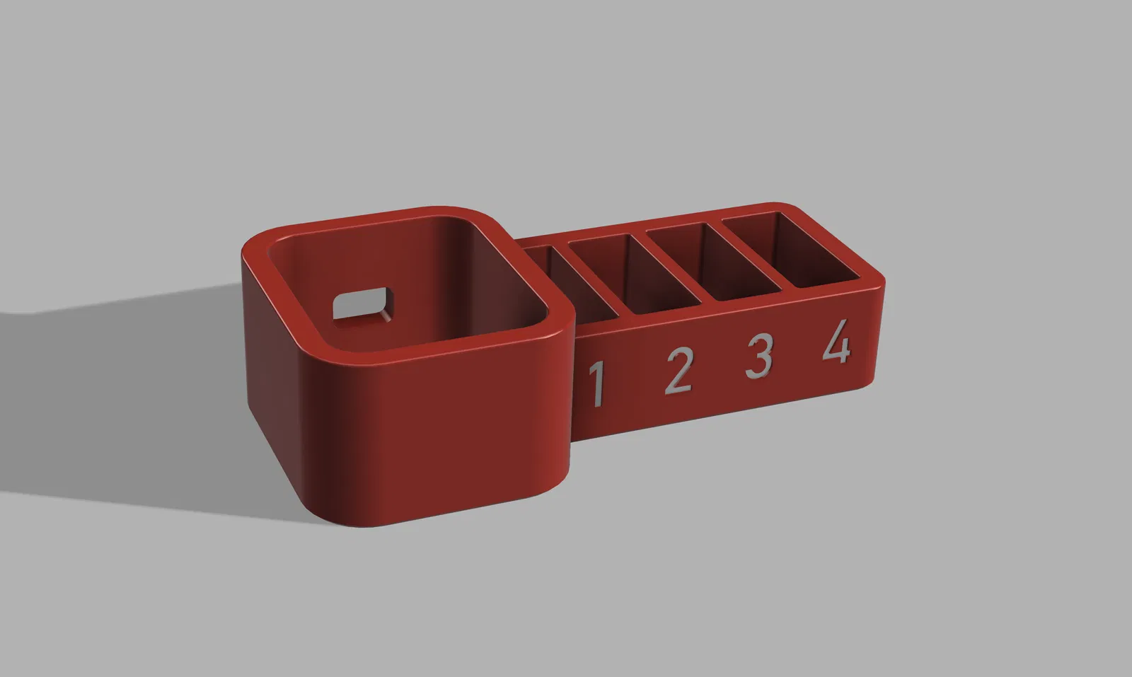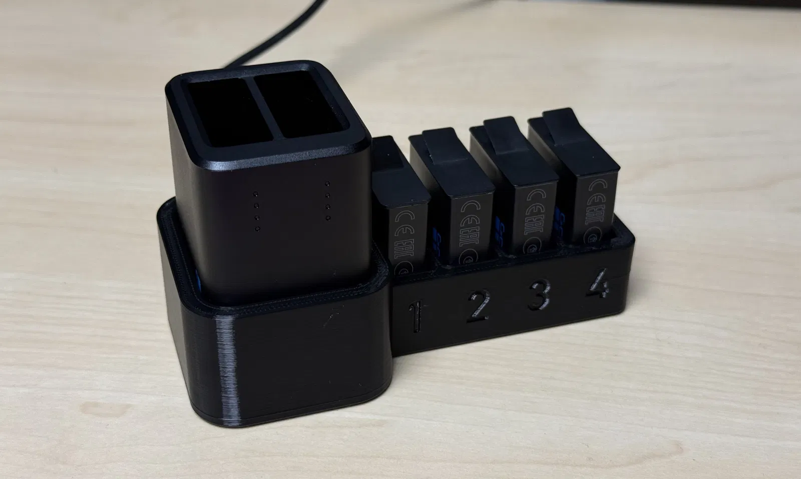 Stand để bàn đơn giản dành cho bộ sạc GoPro và 4 viên pin Hero 13, giúp sắp xếp gọn gàng và dễ lấy khi cần. Phù hợp làm đồ organizer trên bàn làm việc hoặc khu vực setup thiết bị.