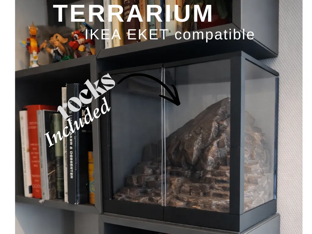 Mẫu terrarium thiết kế để vừa khít kệ IKEA EKET, có kèm phần mô phỏng khối đá. Cần dùng plexiglass dày 3 mm; kích thước các tấm (trước/trái/phải/sau) được liệt kê để cắt lắp.