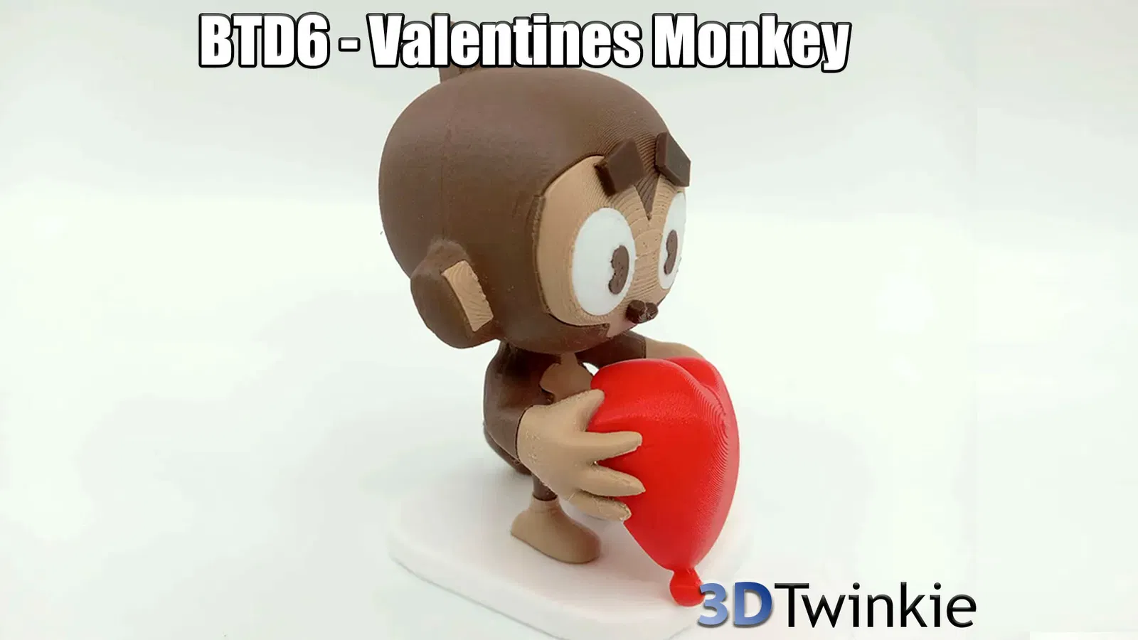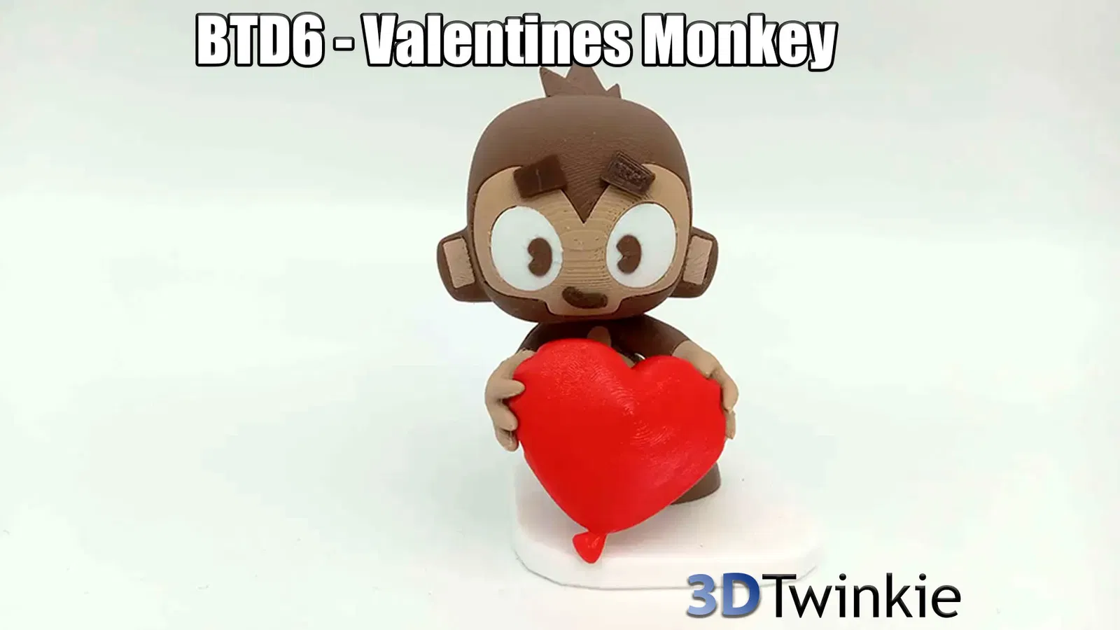 Mẫu Valentines Monkey lấy cảm hứng từ BTD6: chú khỉ ôm regrow bloon hình trái tim để trưng bày dịp Valentine. File đã split trái/phải và theo màu để dễ in single-extruder, khuyến nghị 0.1mm, không cần supports, lắp ráp dùng keo.