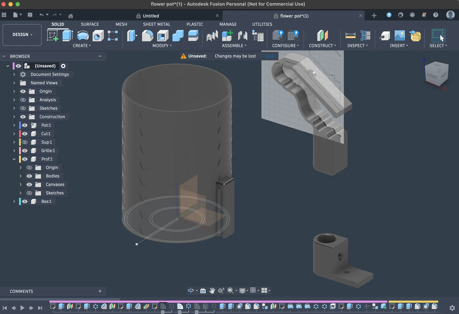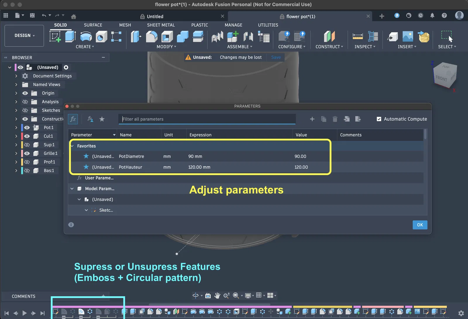 Dự án nhỏ làm trong một cuối tuần mưa: chậu hoa parametric in PLA, có thể chỉnh chiều cao/đường kính trong Fusion 360. Có 3 kiểu embossing patterns bật/tắt; một số chi tiết có thể cần chỉnh tay theo kích thước.