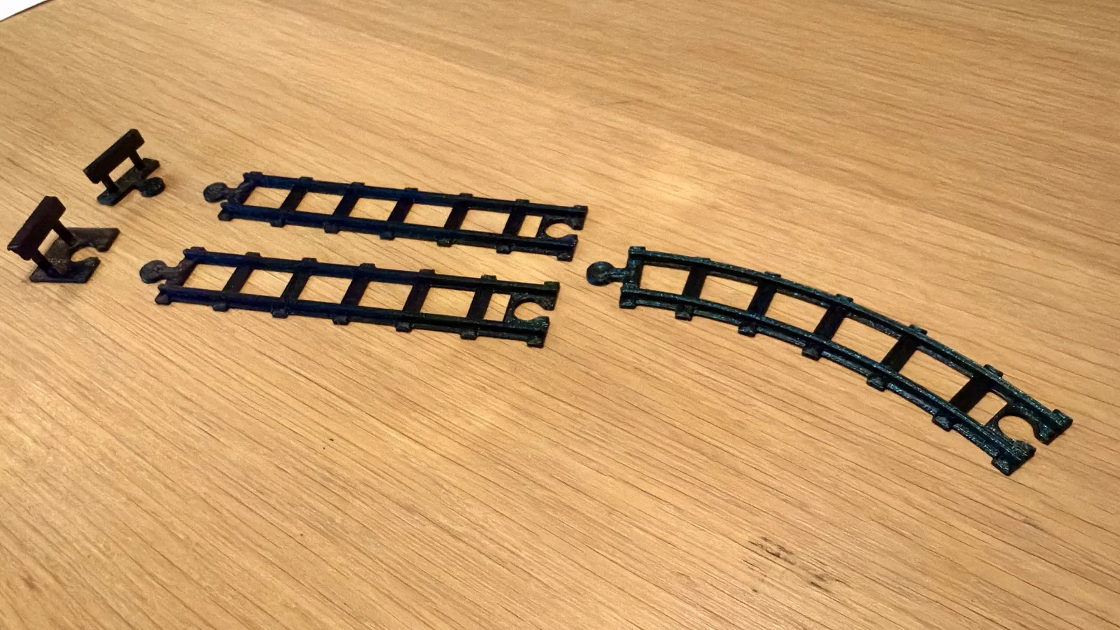 Bộ ray làm cho xe điện (tram) Siku 1011 của con trai mình, tỉ lệ 1:87 (H0). Khoảng cách giữa 2 ray khoảng 11,4 mm (tính phía trong) và mỗi đoạn dài 10 cm. Với các đoạn ở phần đầu/cuối, bạn cần đẩy thanh (bar) vào phần đế. Các khớp nối khá khít nên sẽ cần dùng lực nhẹ để ghép các phần lại với nhau. Với 8 đoạn cong, bạn có thể ráp thành một vòng tròn đầy đủ.