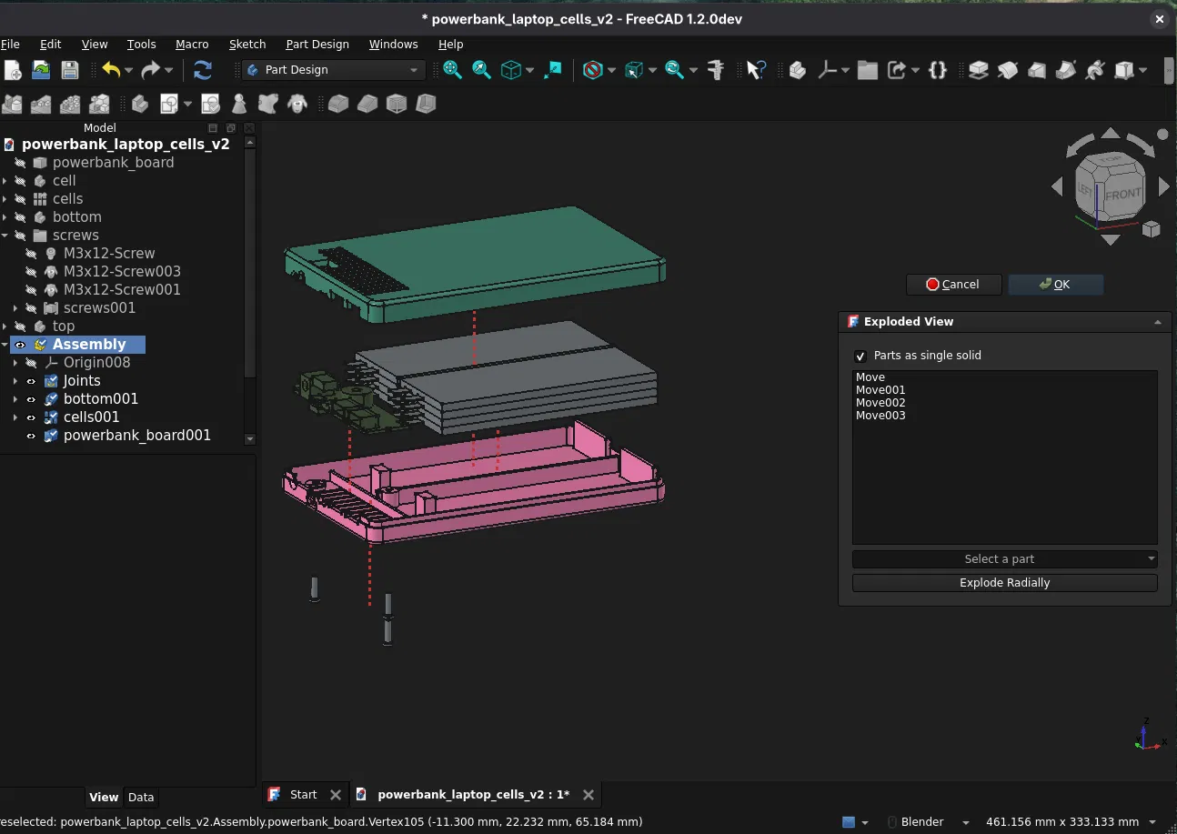 Vậy nên mình quyết định “hồi sinh” mấy cell này thành một cục powerbank. Mình mua một module powerbank mạnh trên Aliexpress, có thể xuất tối đa 100W qua cổng PowerDelivery Type-C. Rồi mình tự thiết kế vỏ bằng FreeCAD (có kèm file nguồn).