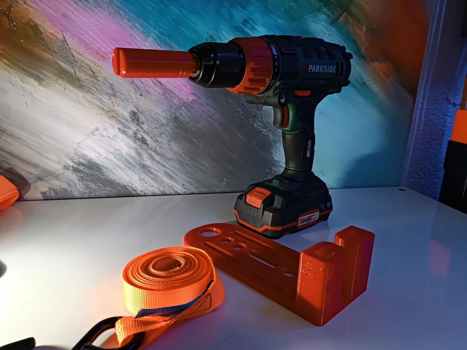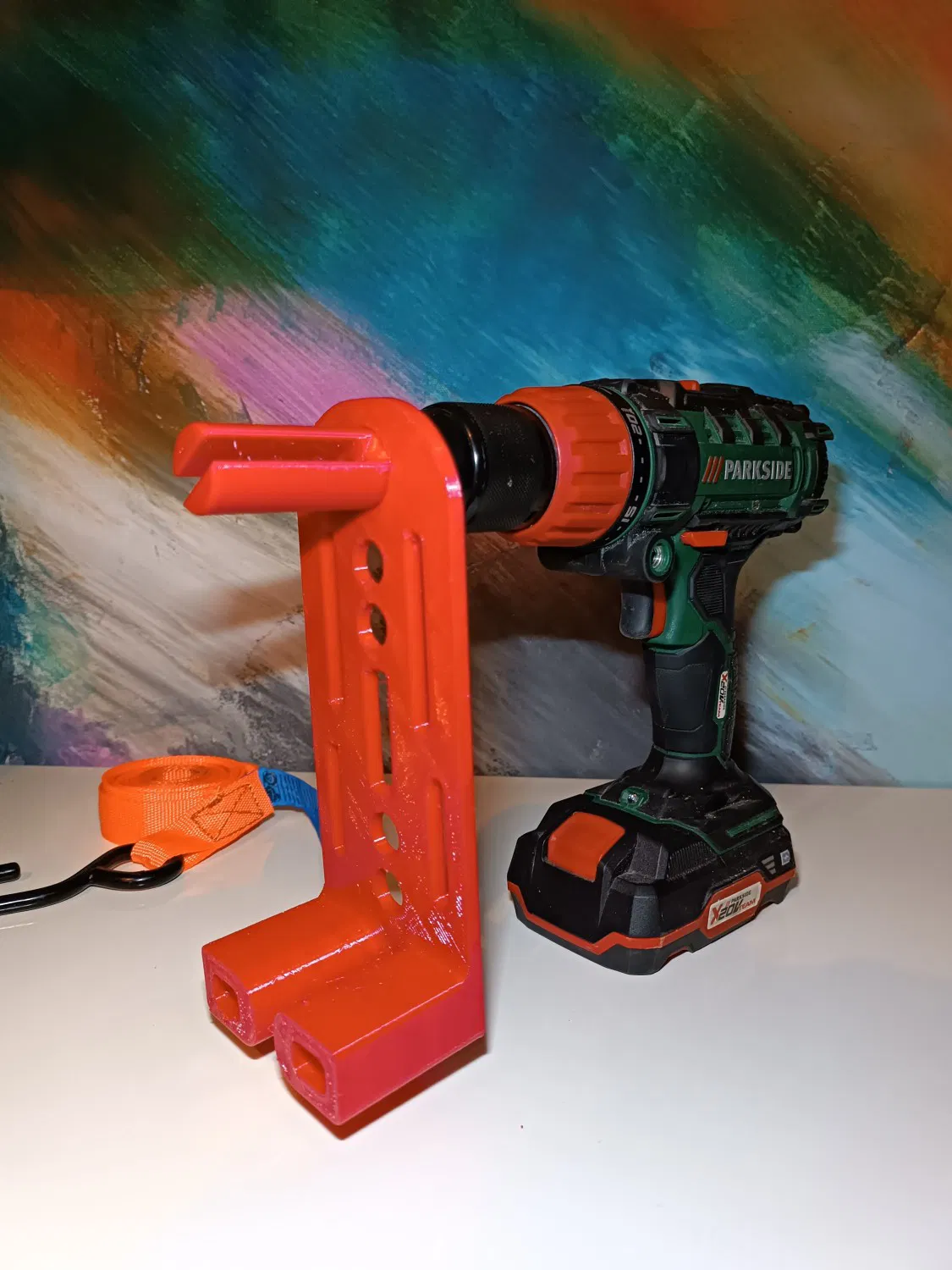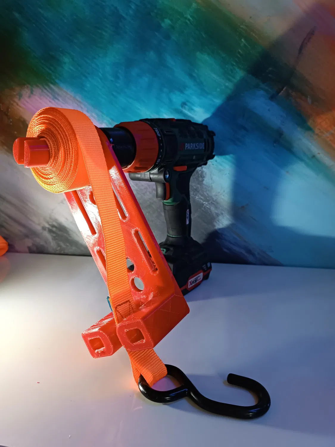 Đặt phần chèn vào mũi khoan và cho nó thông qua "bộ căng" cuộn lên đai và kéo mũi khoan ra.