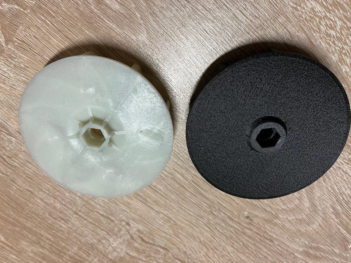 Cánh quạt thay thế cho máy hút lá chạy pin Grizzly - ALS 4025. Mình in bằng Prusa MKS3+ với vật liệu Prusament PETG Carbon Fiber. Để tăng độ bền, mình tăng số perimeters lên 4 và infill lên 30%. Cần supports vì mặt đáy không phẳng do có hốc để đặt đai ốc. Tuy vậy tháo supports rất dễ, nên mặt đáy nhìn vẫn đẹp – xem hình.