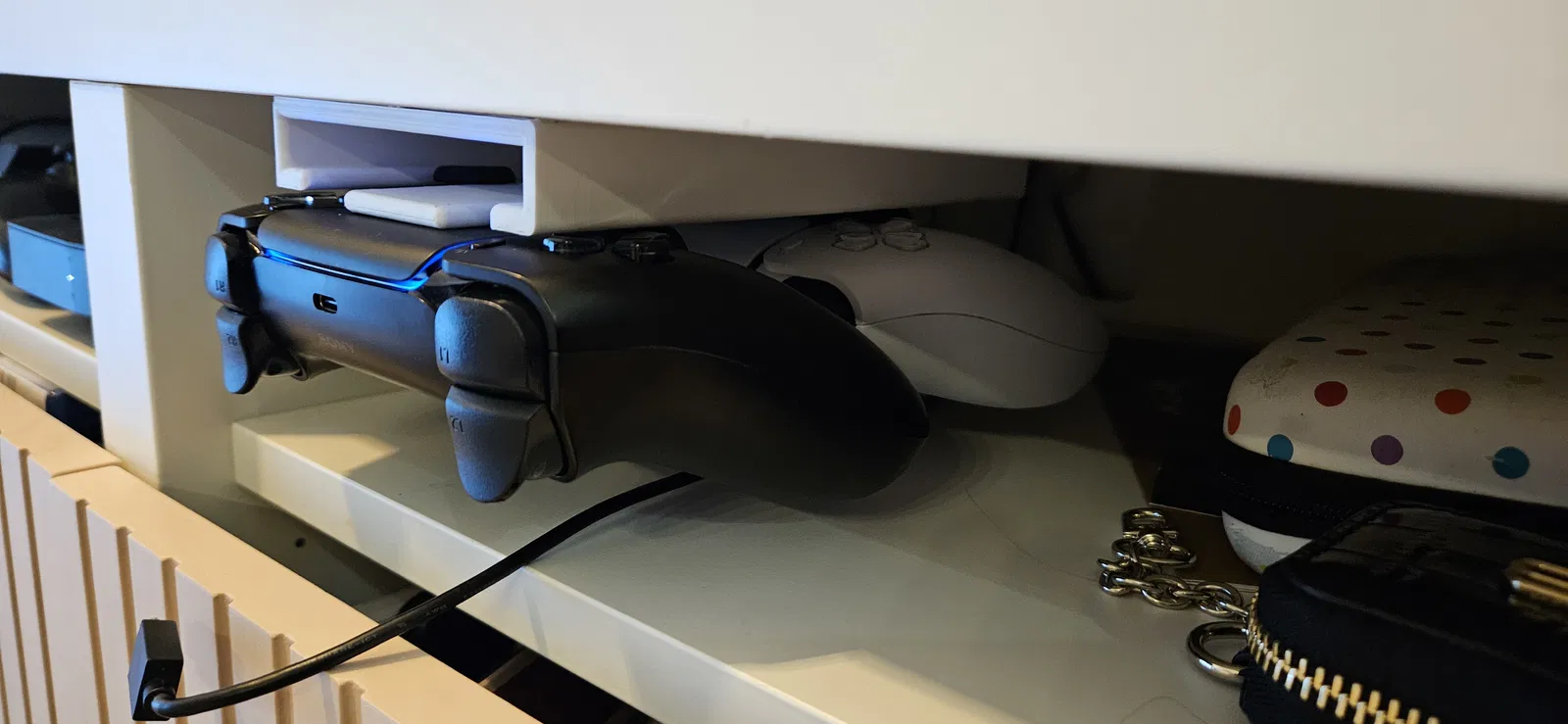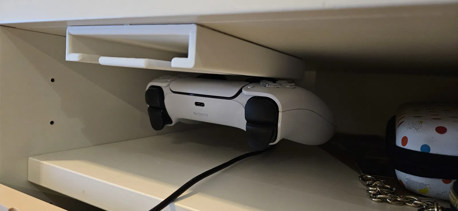 Mẫu giá treo gầm bàn giúp cất gọn 2 tay cầm PS5, tiết kiệm không gian và giữ bàn làm việc ngăn nắp. Phù hợp in 3D để lắp dưới bàn, dễ lấy ra cất vào khi cần.