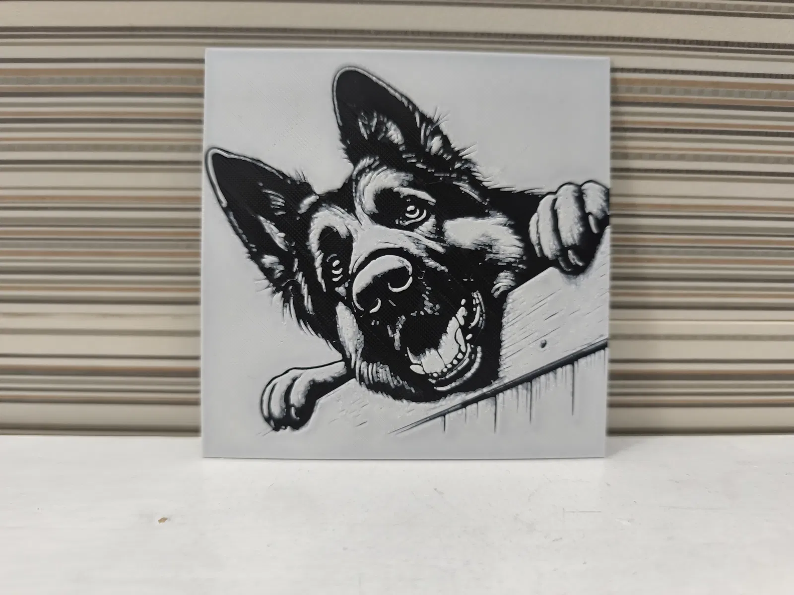 Mẫu Hueforge dog dạng decor/art 2D. Thiết lập in khuyến nghị: 100% infill, layer height 0.08mm, base layer 0.1mm. Hướng dẫn đổi màu: bắt đầu Black, tới layer #7 (0.58mm) đổi sang Jade White.
