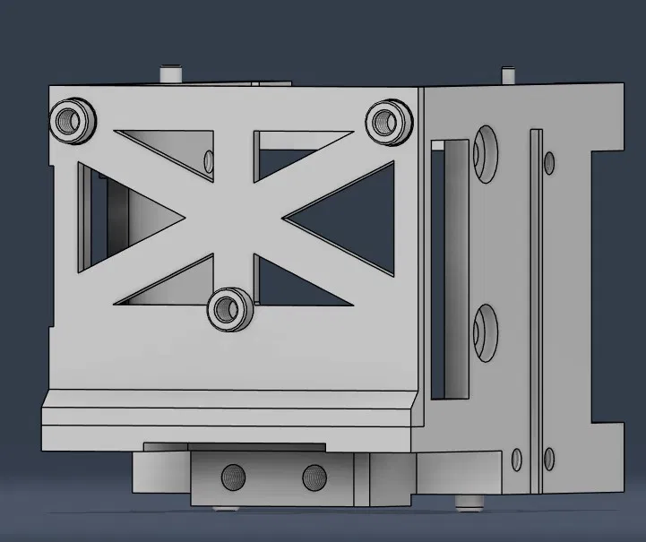 Carriage thay thế cho Creality Ender 5 Max để dùng với DXC extruder. Tương thích hotend zin hoặc nâng cấp Creality Hi/K2. Thiết kế có thể tách 2 phần để giảm support; mẫu thử in ABS ổn và dự định gia công kim loại để test thêm.