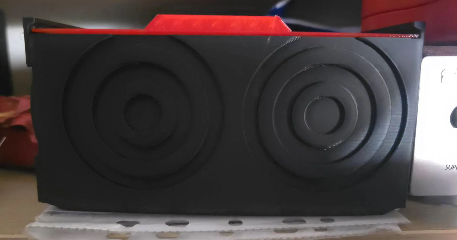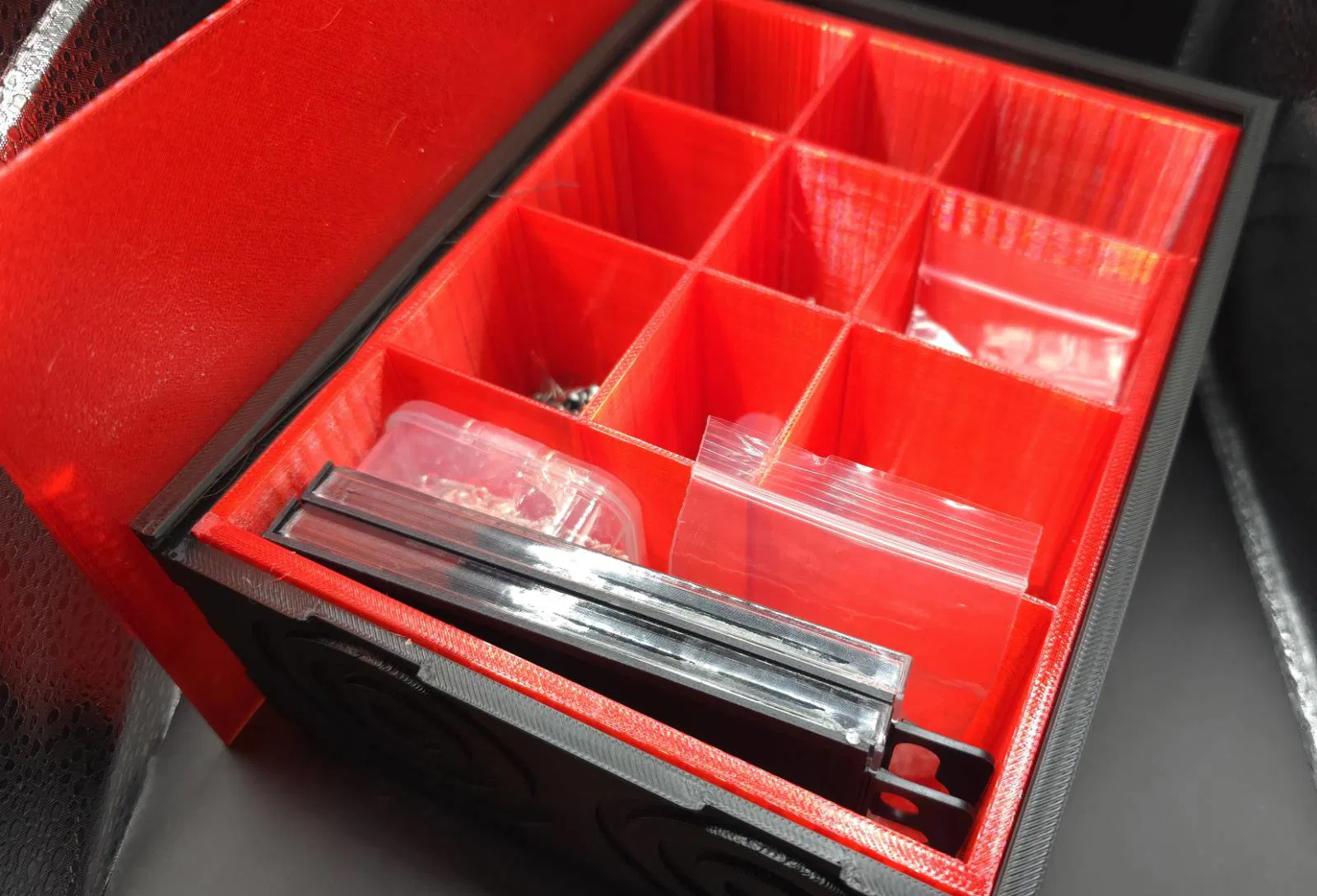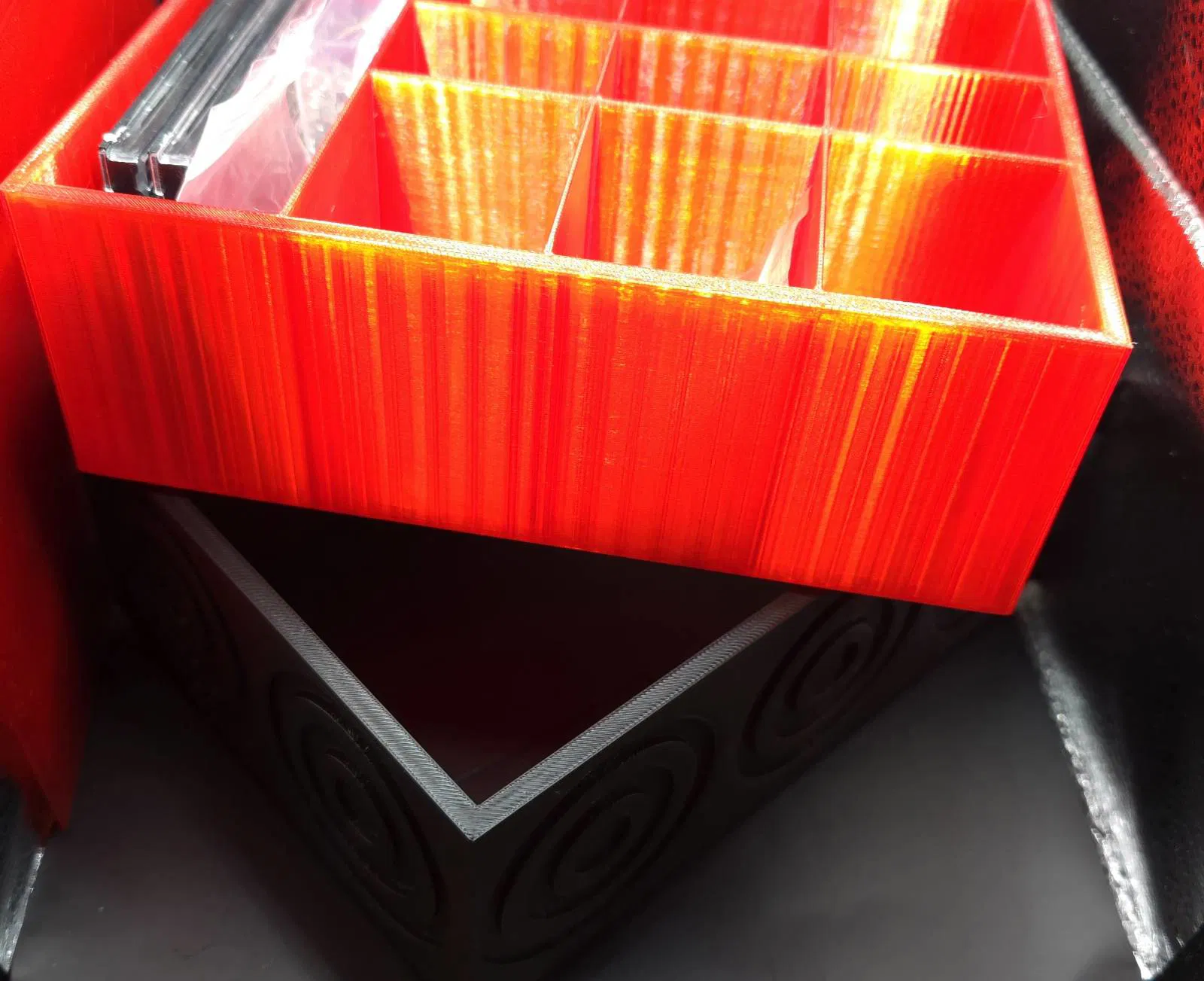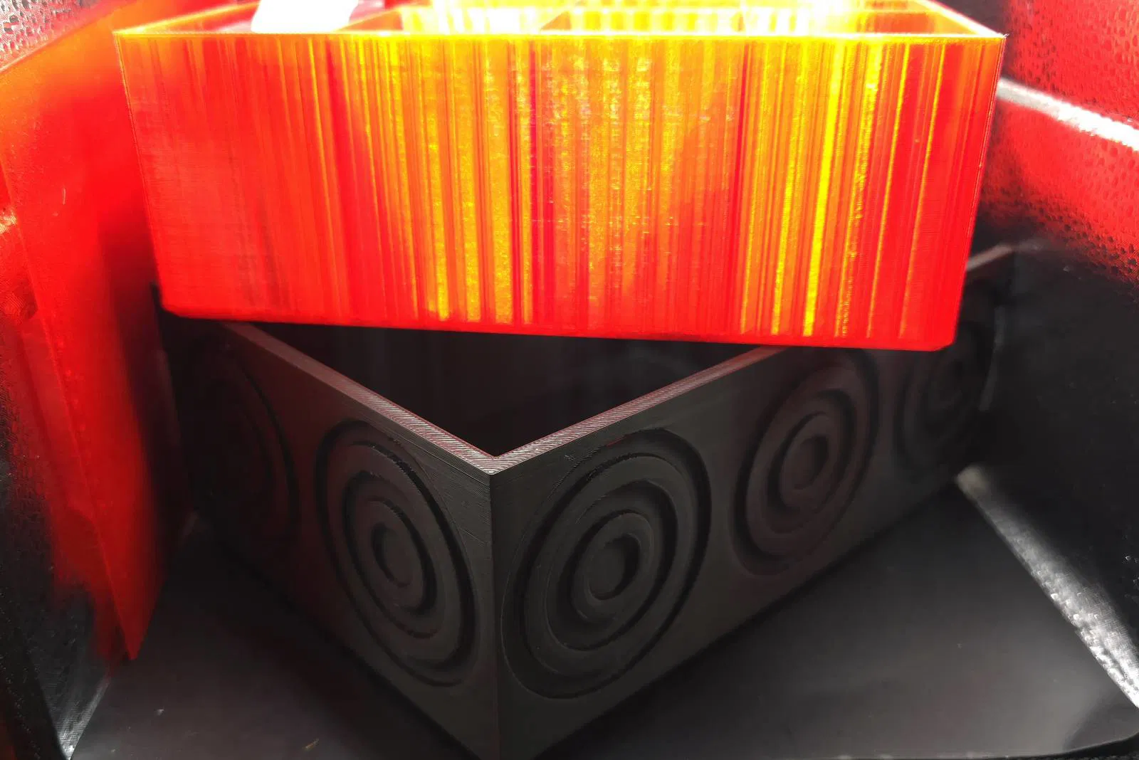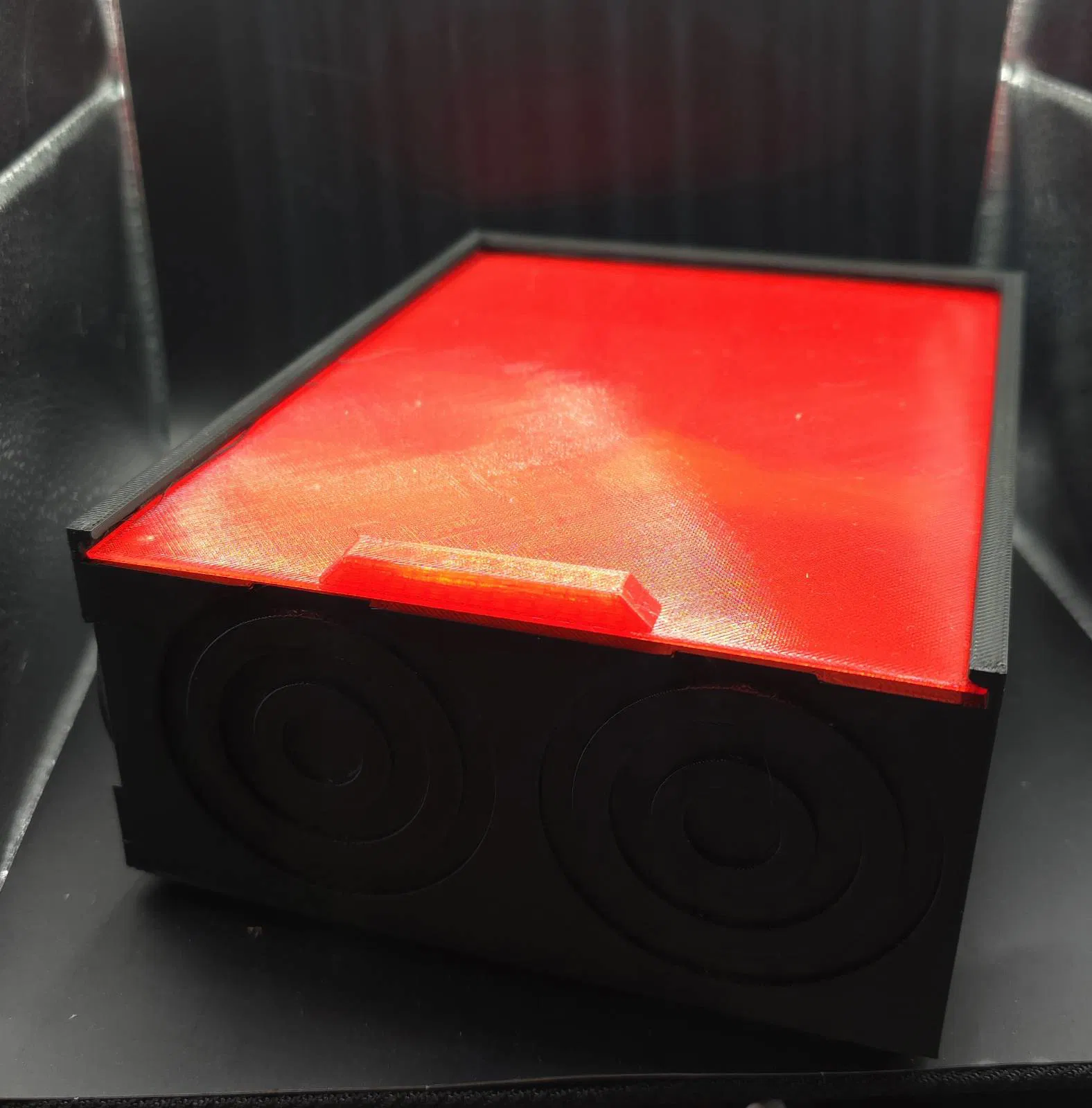 GANIMEDES là hộp đa dụng để cất các món đồ nhỏ lặt vặt. Thiết kế tối giản, tương phản nắp đỏ – đế đen, có họa tiết tròn trang trí. Nên in PLA, infill 20–25%, nắp lắp khít không cần dụng cụ.