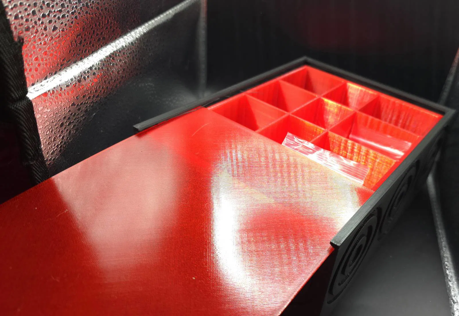 Hộp GANIMEDES được thiết kế theo hướng tối giản nhưng đa dụng, với các đường nét gọn gàng và tương phản màu nổi bật giữa nắp đỏ và phần đế đen. Những họa tiết tròn ở mặt trước tạo điểm nhấn trang trí nhẹ, giúp tổng thể nhìn bắt mắt hơn.
