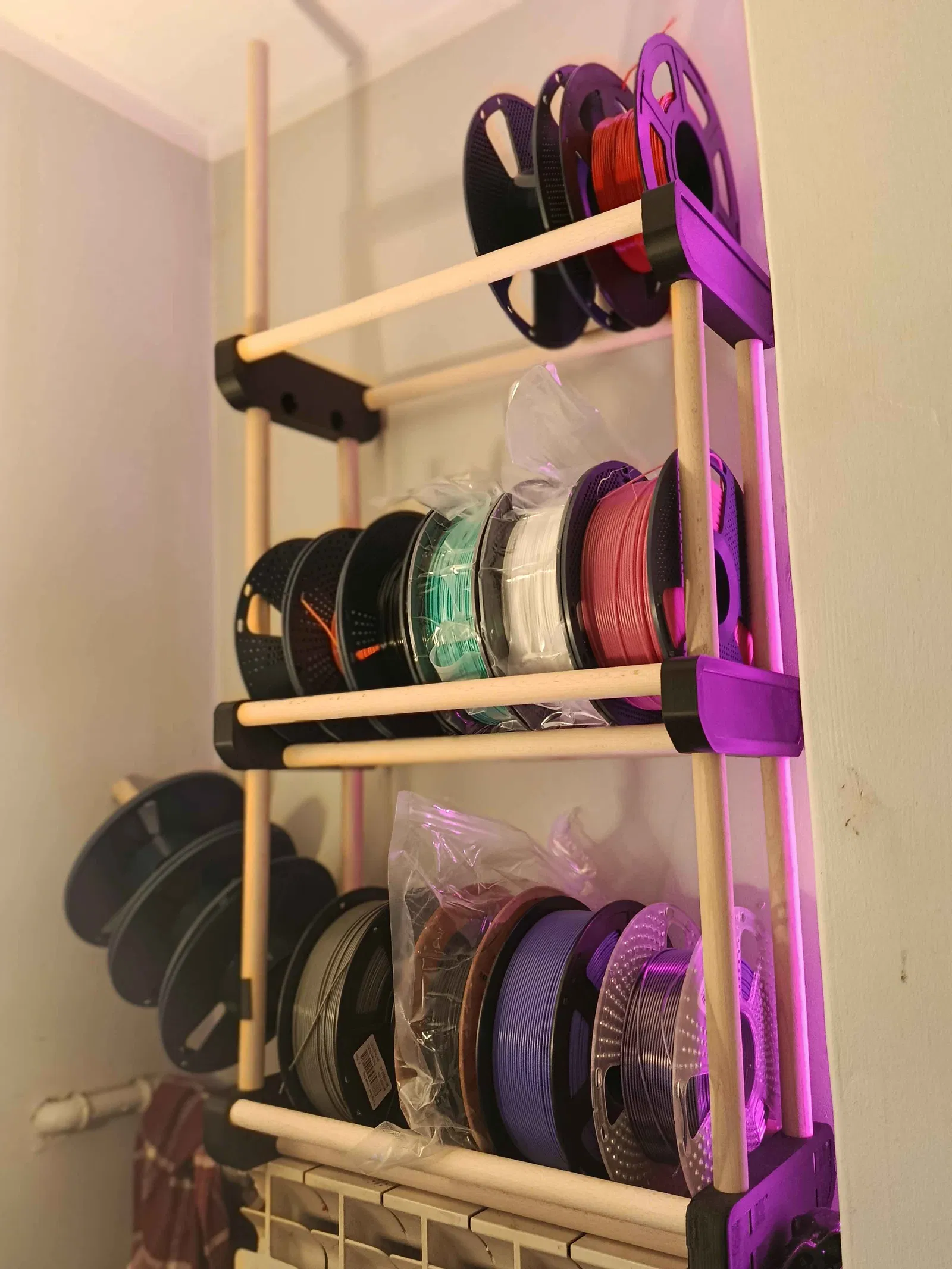 Giá để cuộn filament dạng module, xếp chồng được, dùng thanh gỗ 20 mm. Thiết kế tiết kiệm diện tích, dễ mở rộng nhiều tầng; khuyến nghị in 98% để press-fit, có thêm clip-on cho cuộn refill rỗng.