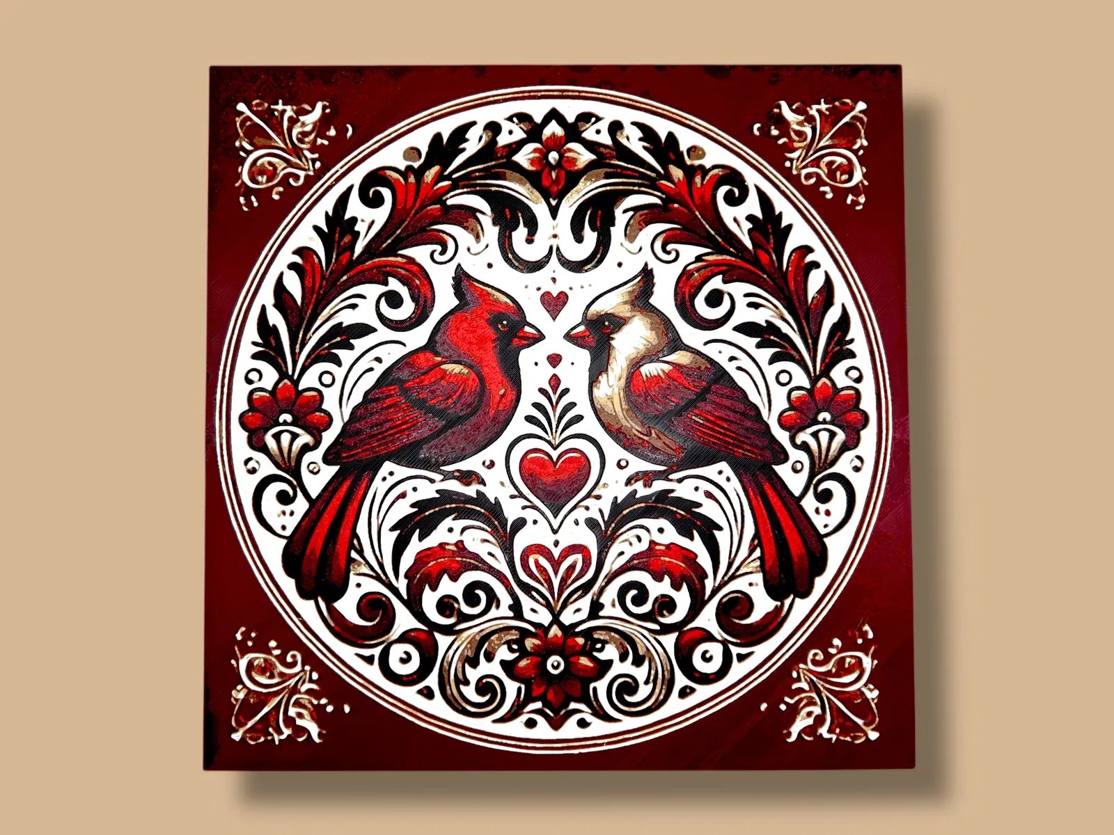 Thiết kế Hueforge phong cách folk-art lãng mạn với hai chim cardinal đối mặt trong huy hiệu tròn đầy hoa văn và trái tim. Tương phản nhiều lớp nổi bật, hợp trang trí Valentine, mùa đông hoặc trưng quanh năm.
