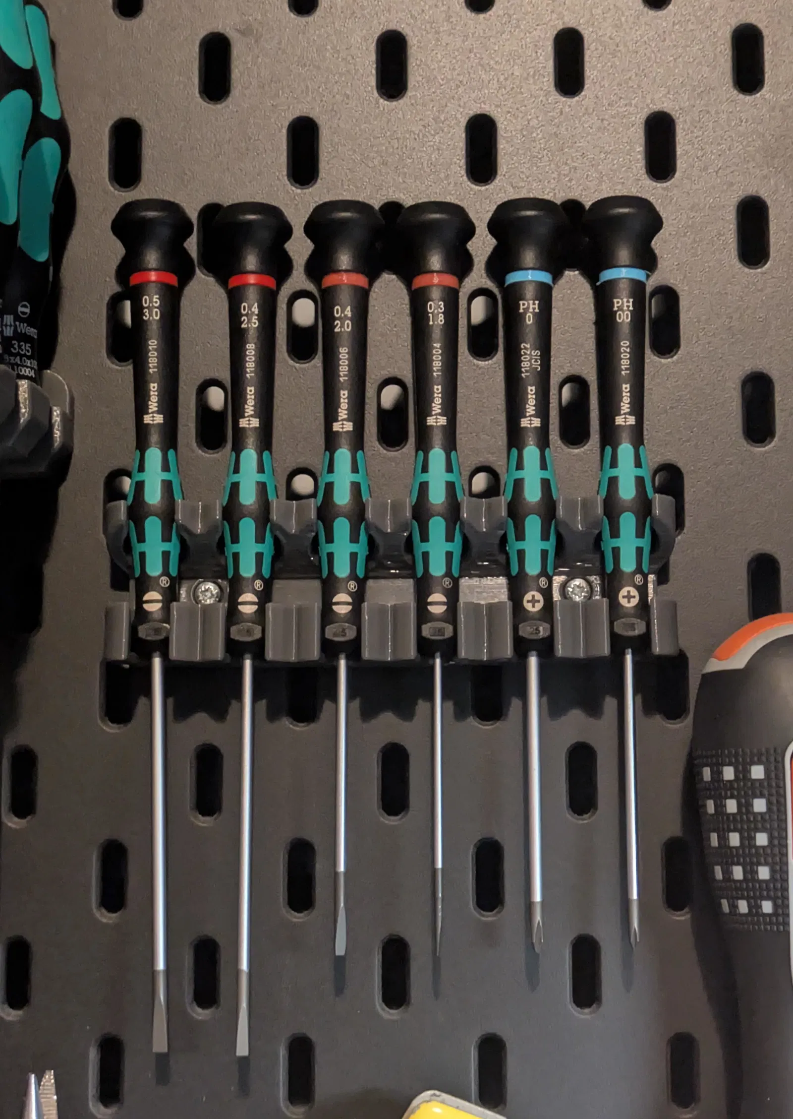 Giá treo 6 tua vít Wera Kraftform Micro gắn lên bảng Ikea Skadis bằng 2 T-Nut. In theo orientation có sẵn, không cần support. Dùng vít M3 (counterbore 6.5mm), cũng có thể dùng T-Nut M2/M2.5 kèm washer.