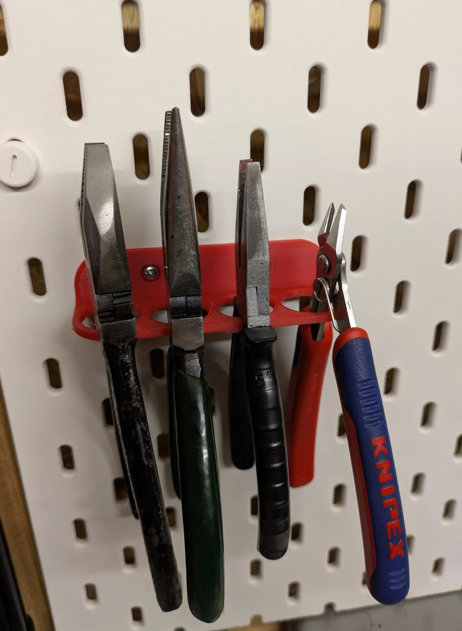 Giá treo gắn lên bảng Ikea Skadis bằng 2 T-nut, chứa tối đa 4 cây kìm cỡ nhỏ. Lỗ cán 20mm, in theo orientation có sẵn. Thiết kế cho ốc M3 (counterbore 6.5mm), cũng hỗ trợ T-nut M2/M2.5 kèm washer.