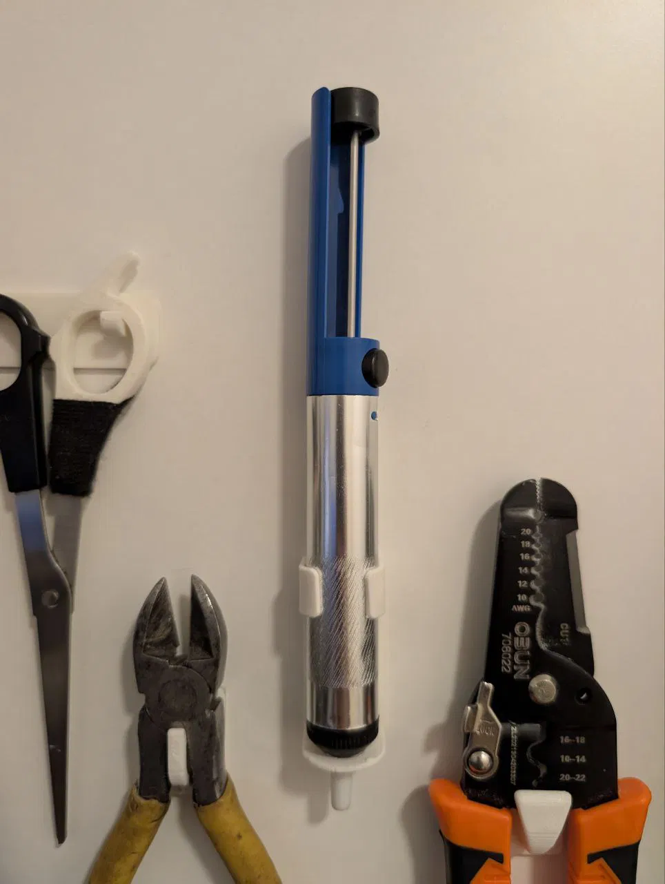 Đây là một giá treo tường dạng chức năng, giúp bạn để gọn manual desoldering pump và lấy dùng nhanh khi cần. Thiết kế có phần đỡ phía dưới để chịu tải, kèm ngàm trên kiểu "C-clip" để bấm chặt dụng cụ vào đúng vị trí.