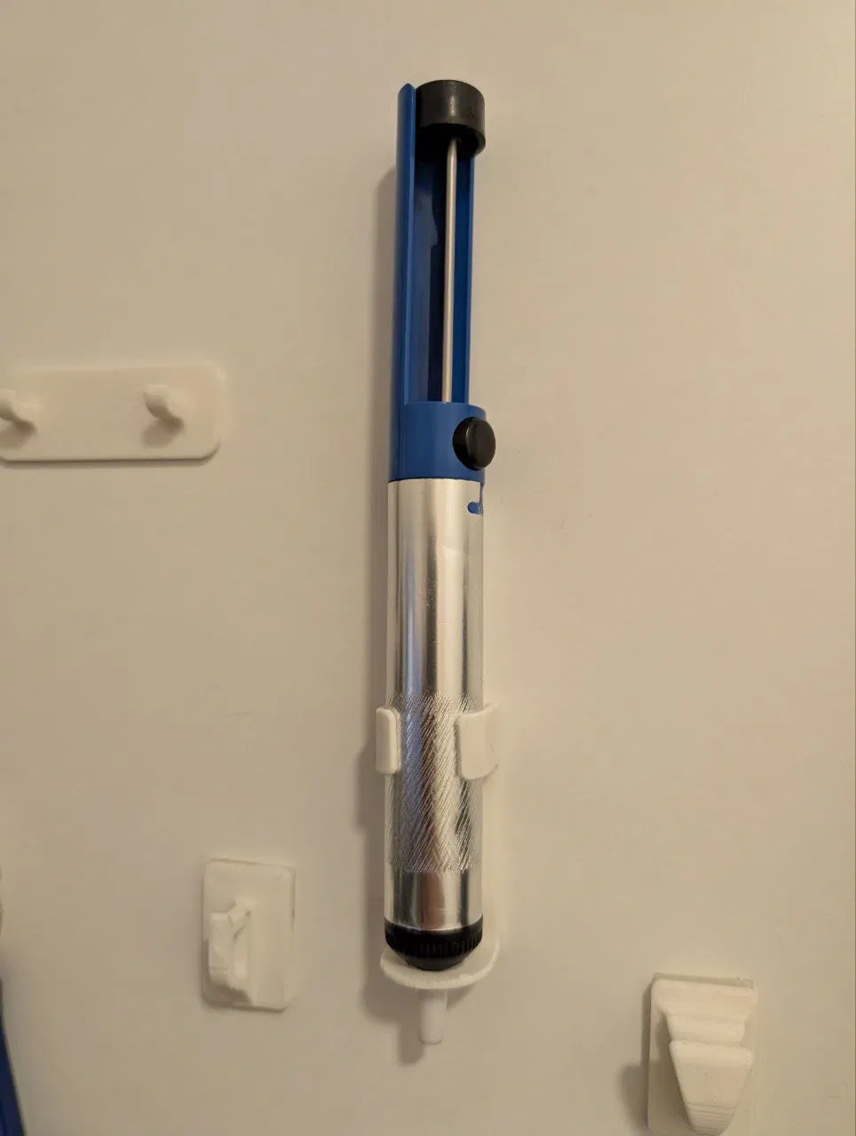 Giá treo tường đơn giản và chắc chắn để cất manual desoldering pump theo phương thẳng đứng. Có đỡ dưới chịu lực và ngàm C-clip bấm giữ, giúp gọn bàn và tránh dụng cụ lăn trên workbench.