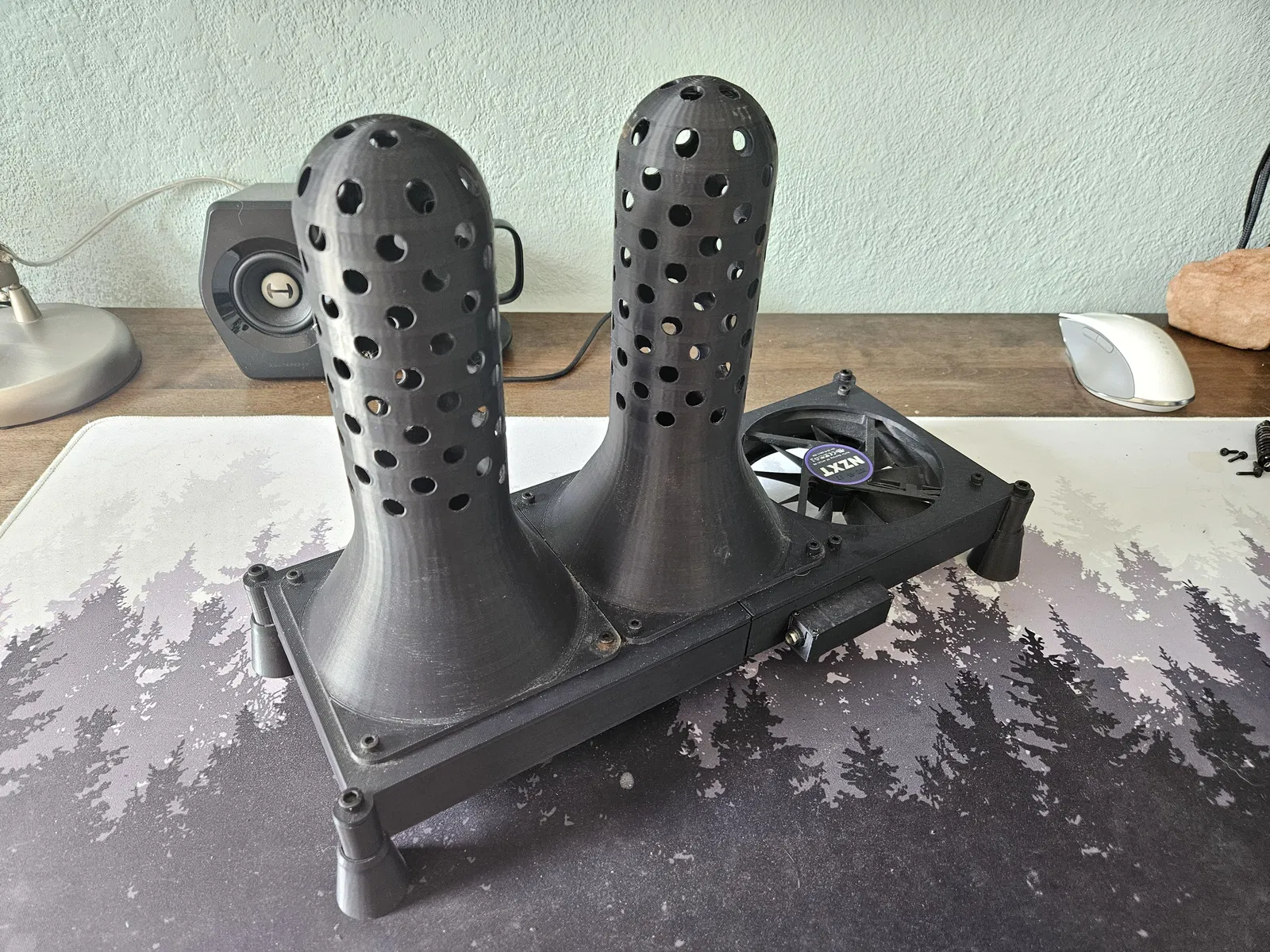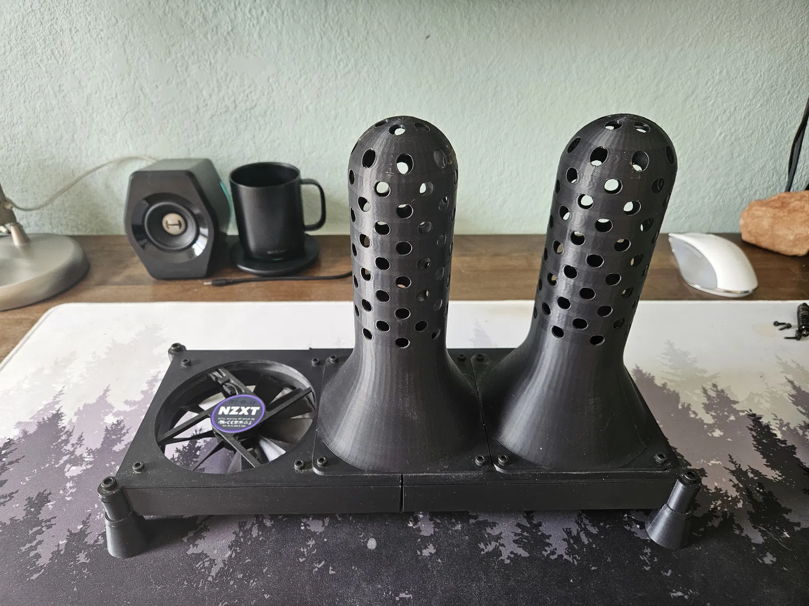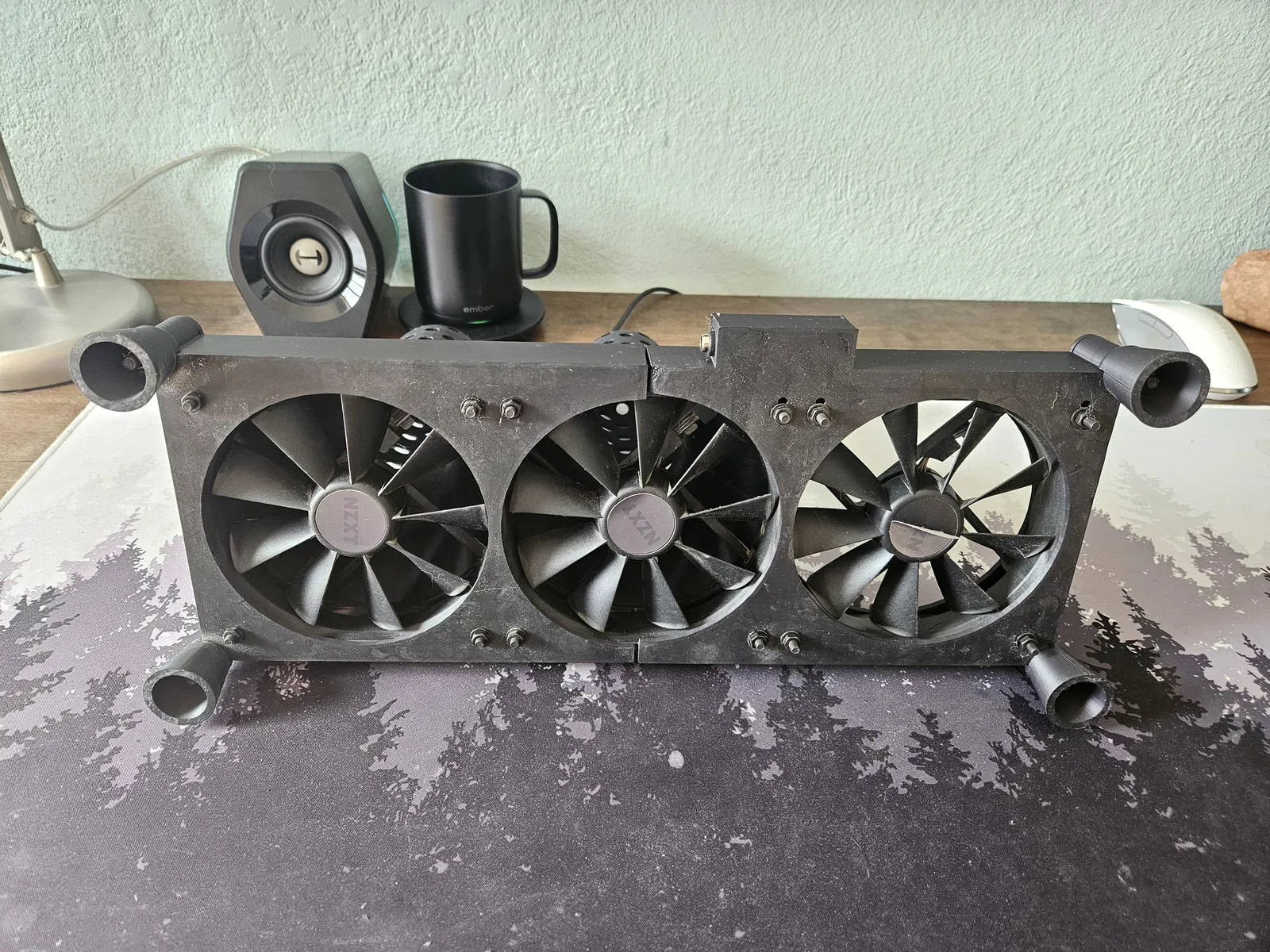 Máy sấy giày dùng 3 quạt PC 120mm mình có sẵn. Mình đấu dây tất cả quạt vào một DC barrel jack và dùng một sợi cáp nguồn DC dư sẵn. Mình dùng để sấy giày MTB (mountain bike) và cả nón bảo hiểm.