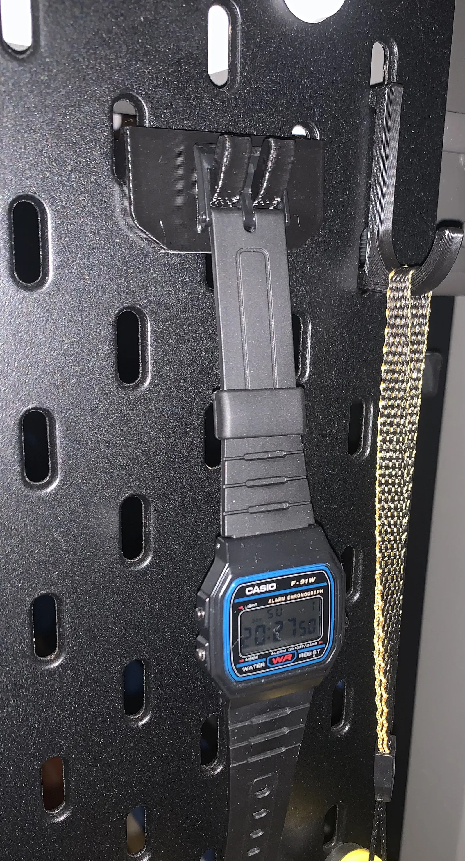 Mẫu móc treo đồng hồ dành cho bảng pegboard Ikea Skadis. Thiết kế phù hợp với đồng hồ có khóa/buckle lớn hơn 15 mm, giúp treo gọn gàng và dễ lấy khi cần.