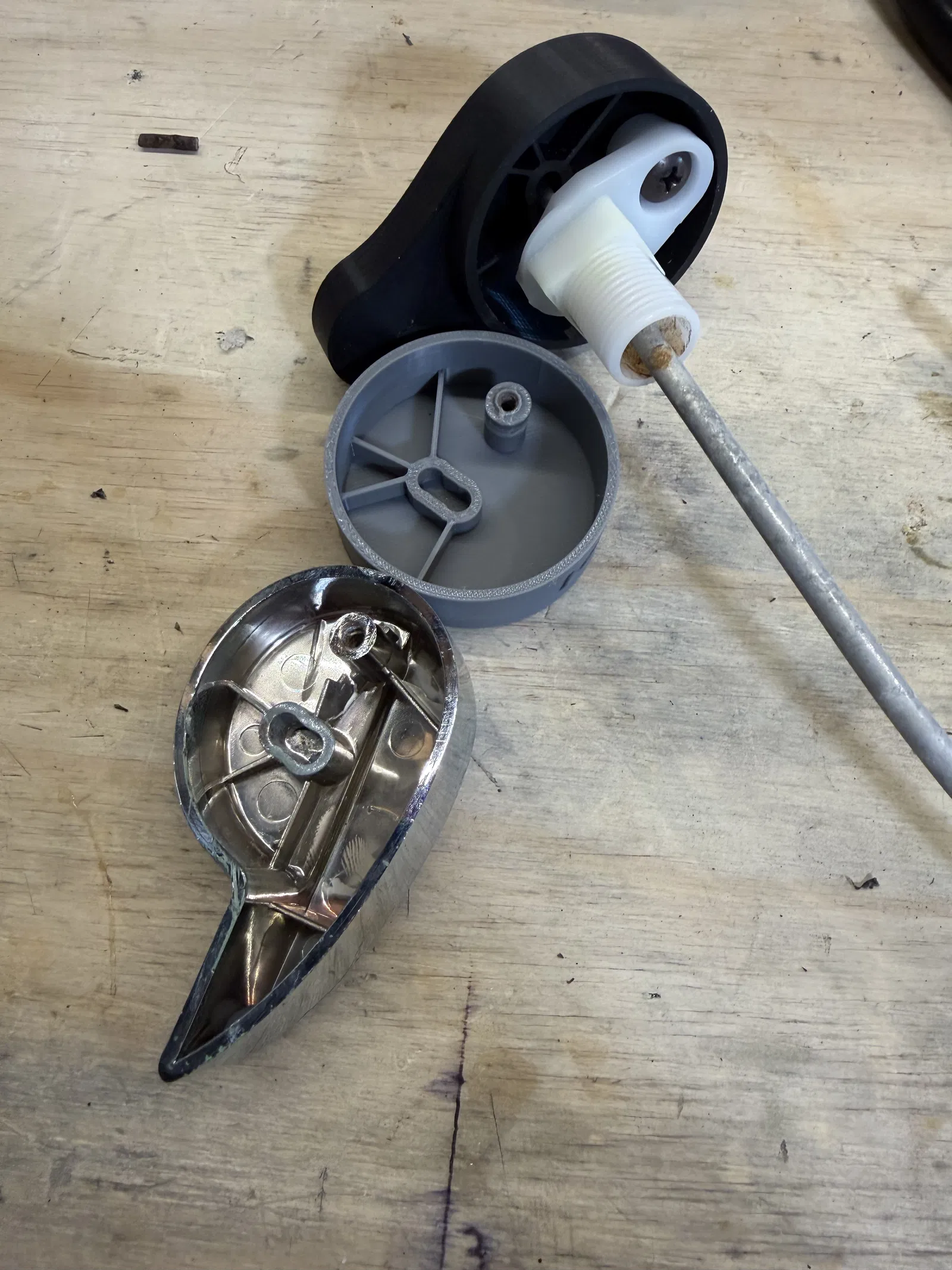 Mình làm một tay gạt xả bồn cầu thay thế — kiểu lever của Toto (gạt) thay vì kiểu xoay — để thay cho cái tay gạt nhựa mạ chrome rẻ tiền. Ngoài chuyện nó không ăn nhập gì với phần remodel nhà tắm của mình, cái cũ còn là bản nhựa “nhái” của tay thay thế Toto chính hãng vốn được cho là làm bằng hợp kim kẽm (pot metal). Dù sao thì đồ kim loại vẫn có trọng lượng, cầm chắc tay hơn.
