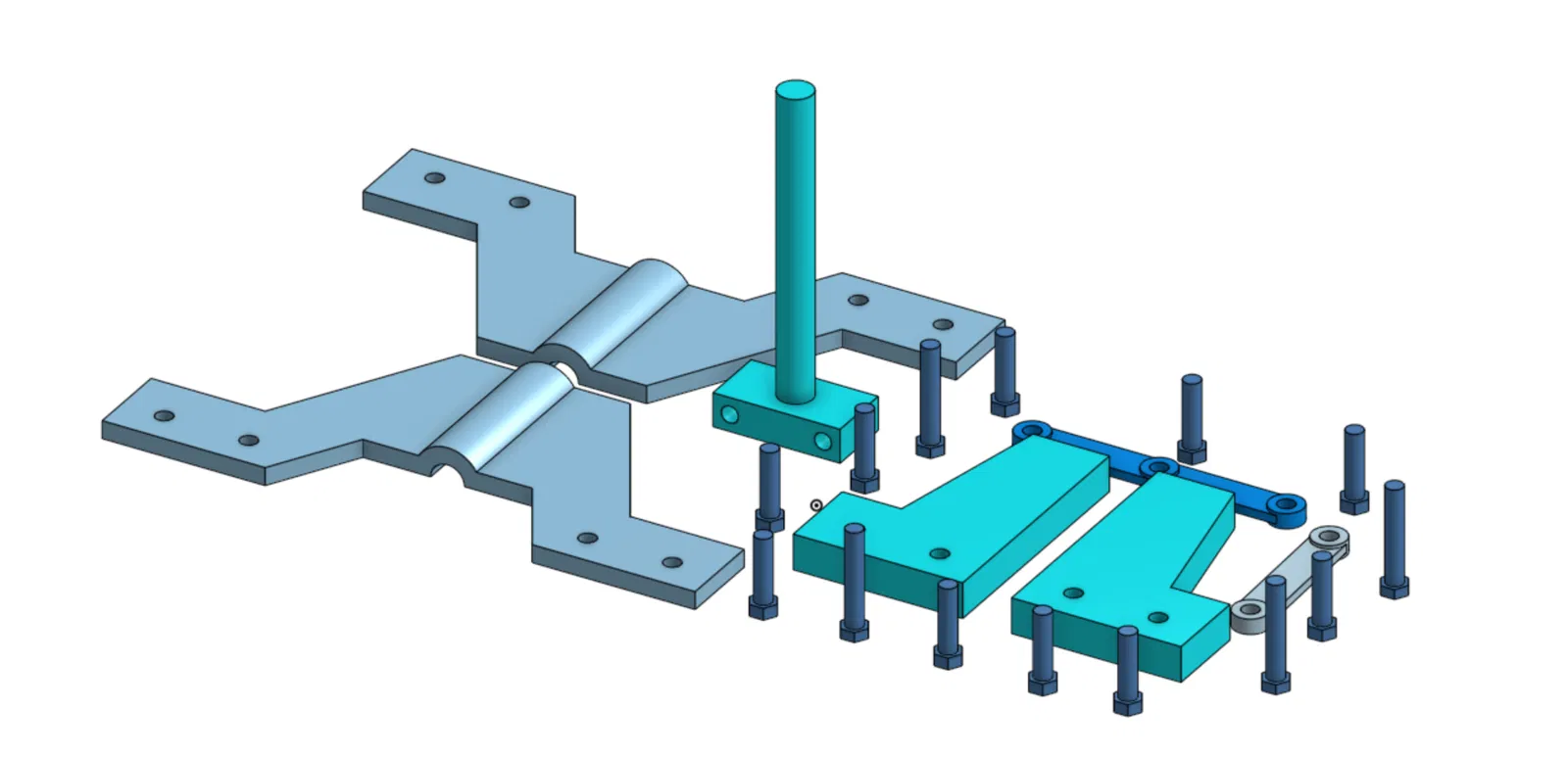 Mẫu gripper cơ khí dạng tĩnh, thiết kế để trưng bày. Mẫu thể hiện hình học đóng–mở (contraction-and-release) bằng các liên kết (linkages) và chốt (pins) cố định, lắp ráp bằng các mối ghép bắt chặt (fastened mates) để minh hoạ cấu trúc cơ cấu mà không có chuyển động.