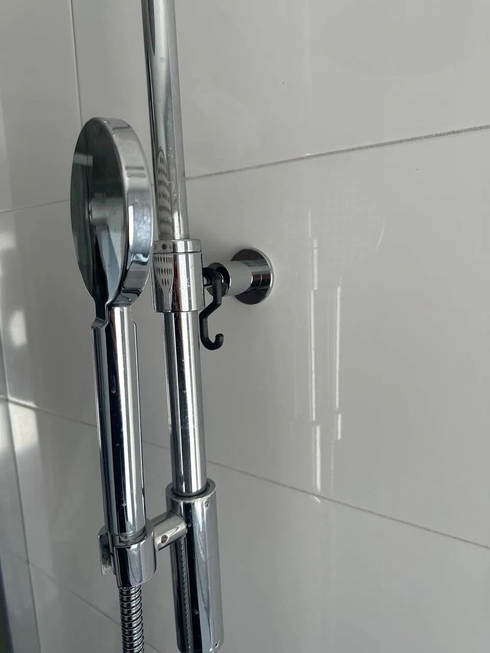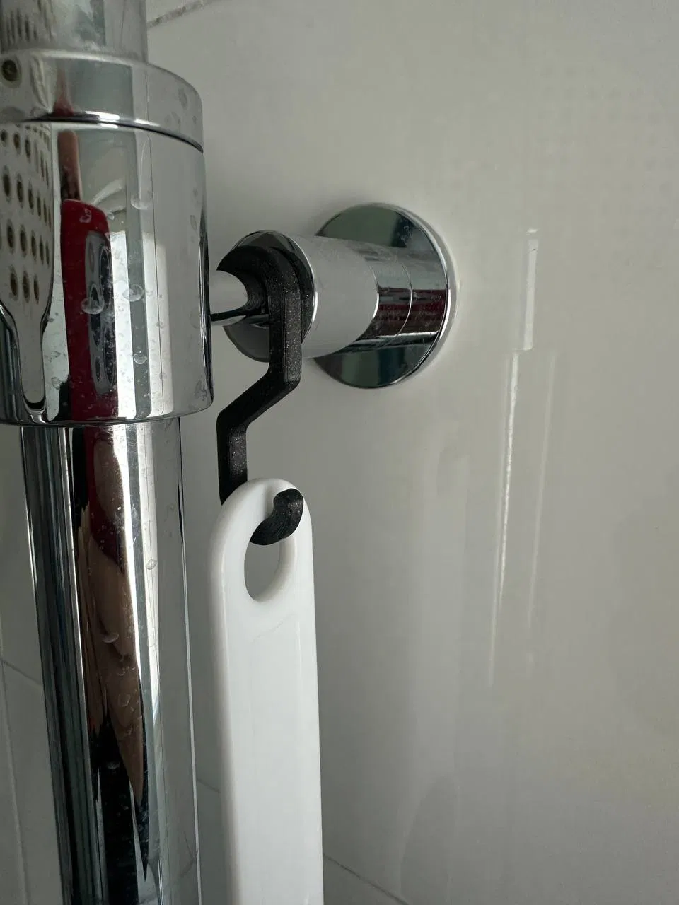 Đồ cứ hay rớt xuống sàn vì để cân bằng trên vòi sen. Giải pháp là cái móc này, thiết kế để gắn vừa một cây ty kim loại 10mm là một phần của bộ vòi sen.