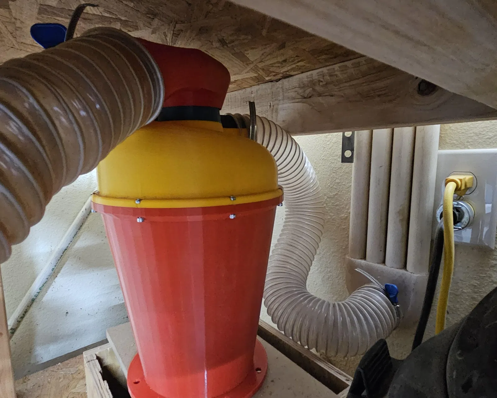 Chi tiết này dạng slip-fit, ôm vừa đủ chặt vào cyclone nên mình chọn không dùng keo. Nó cũng có thể xoay gần như một vòng để canh chỉnh hướng ống. Đầu ra OD 2.5".