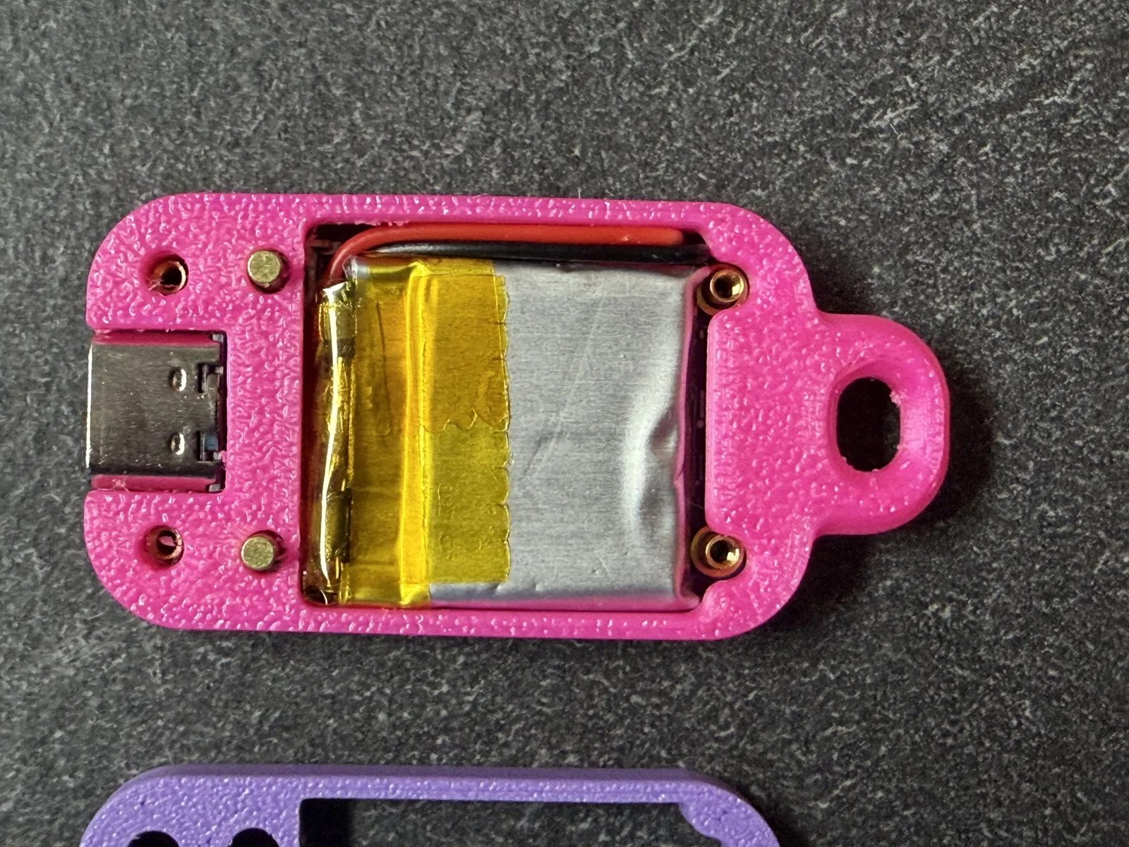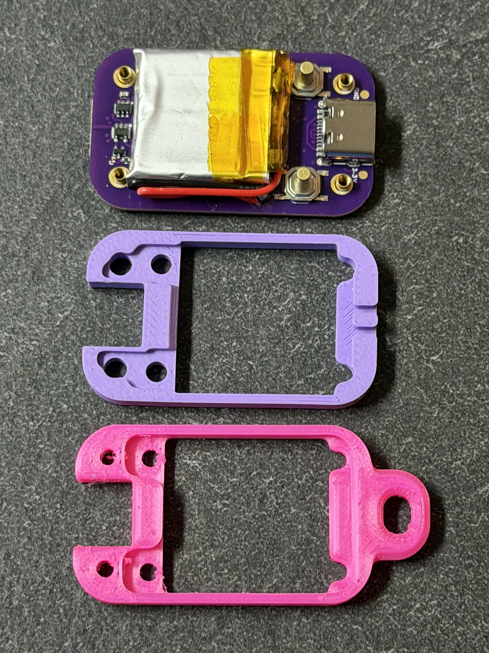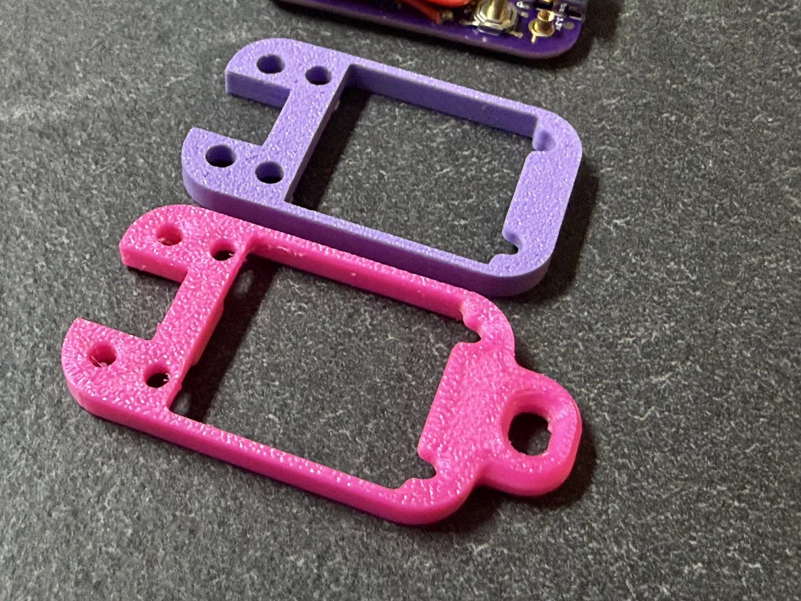 Mình chỉ muốn một cái đế “rugged”, khoen dày và chắc để gắn vào móc khóa mà nhìn vẫn ổn. Nên mình tự thiết kế cái của riêng mình, dựa trên bản gốc (màu tím trong hình). Mình làm các lỗ cho ốc và nút bấm khít hơn một chút, và bỏ bớt các khoang rỗng không cần thiết khi có thể.
