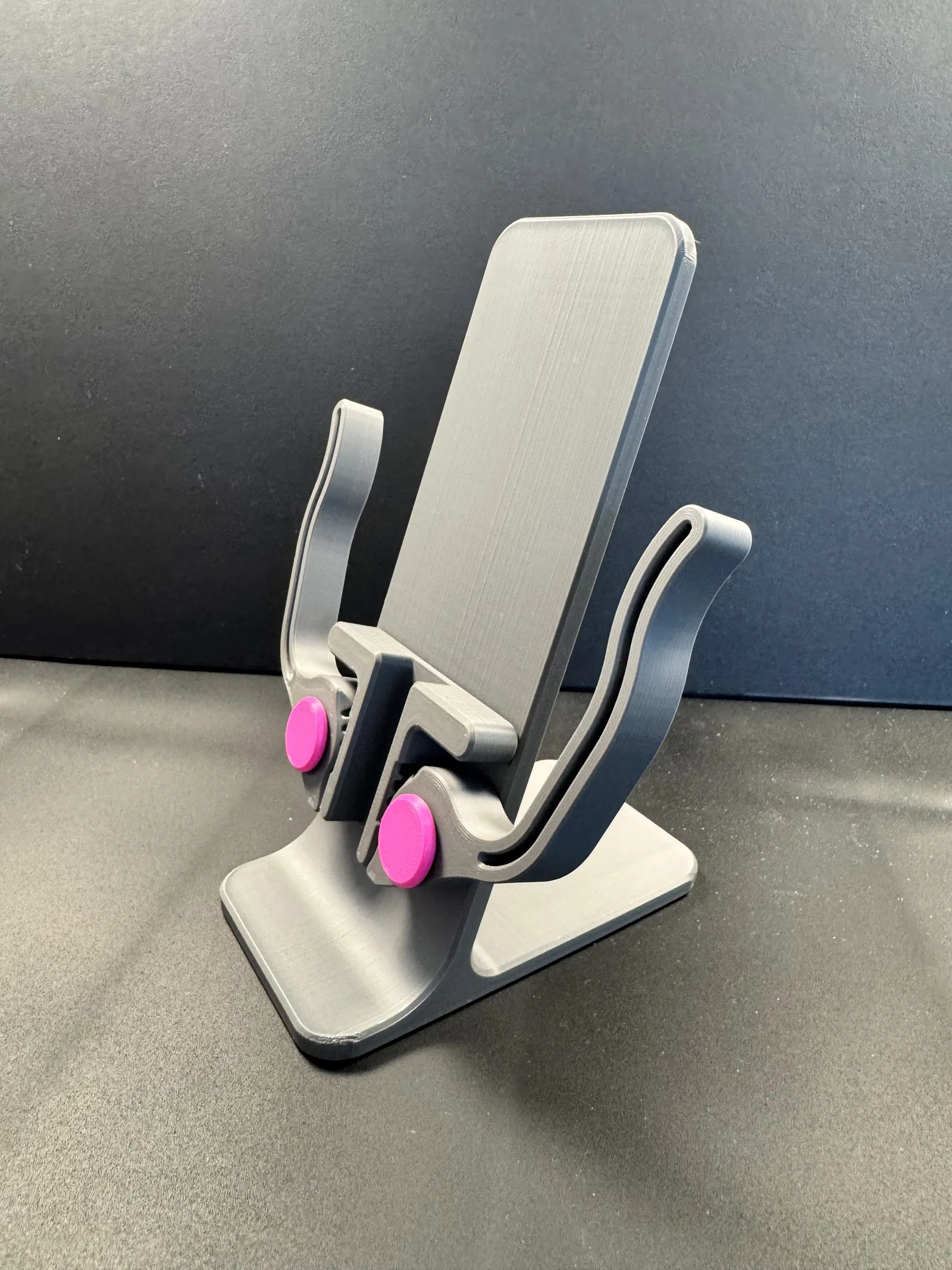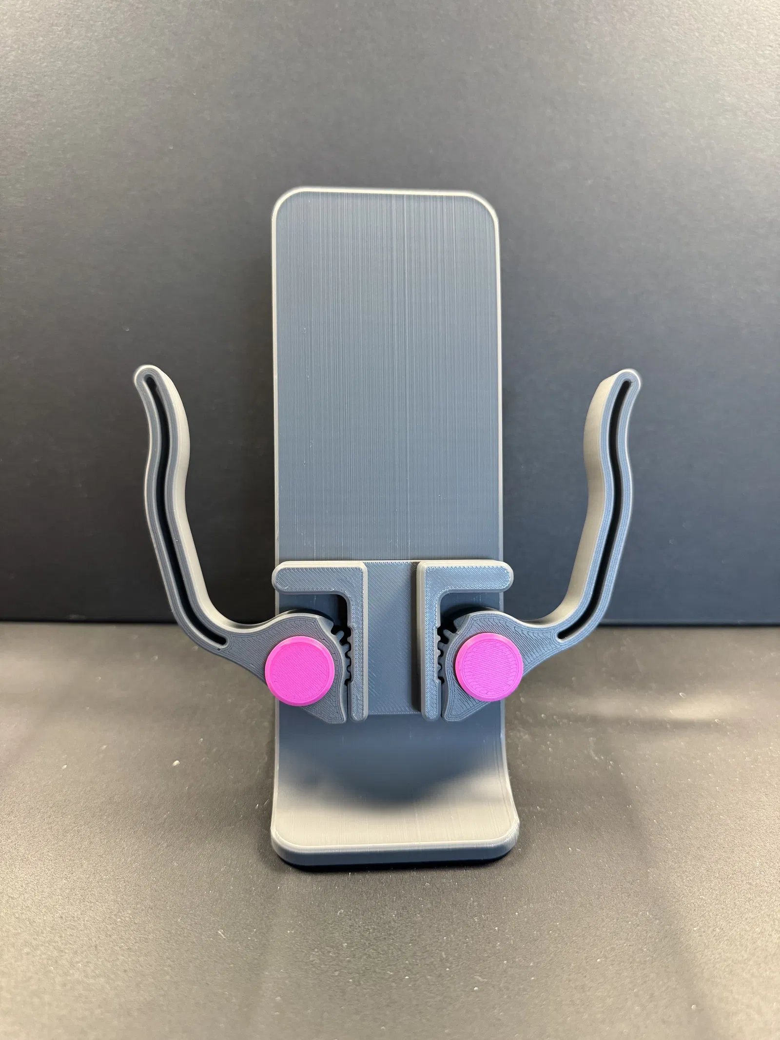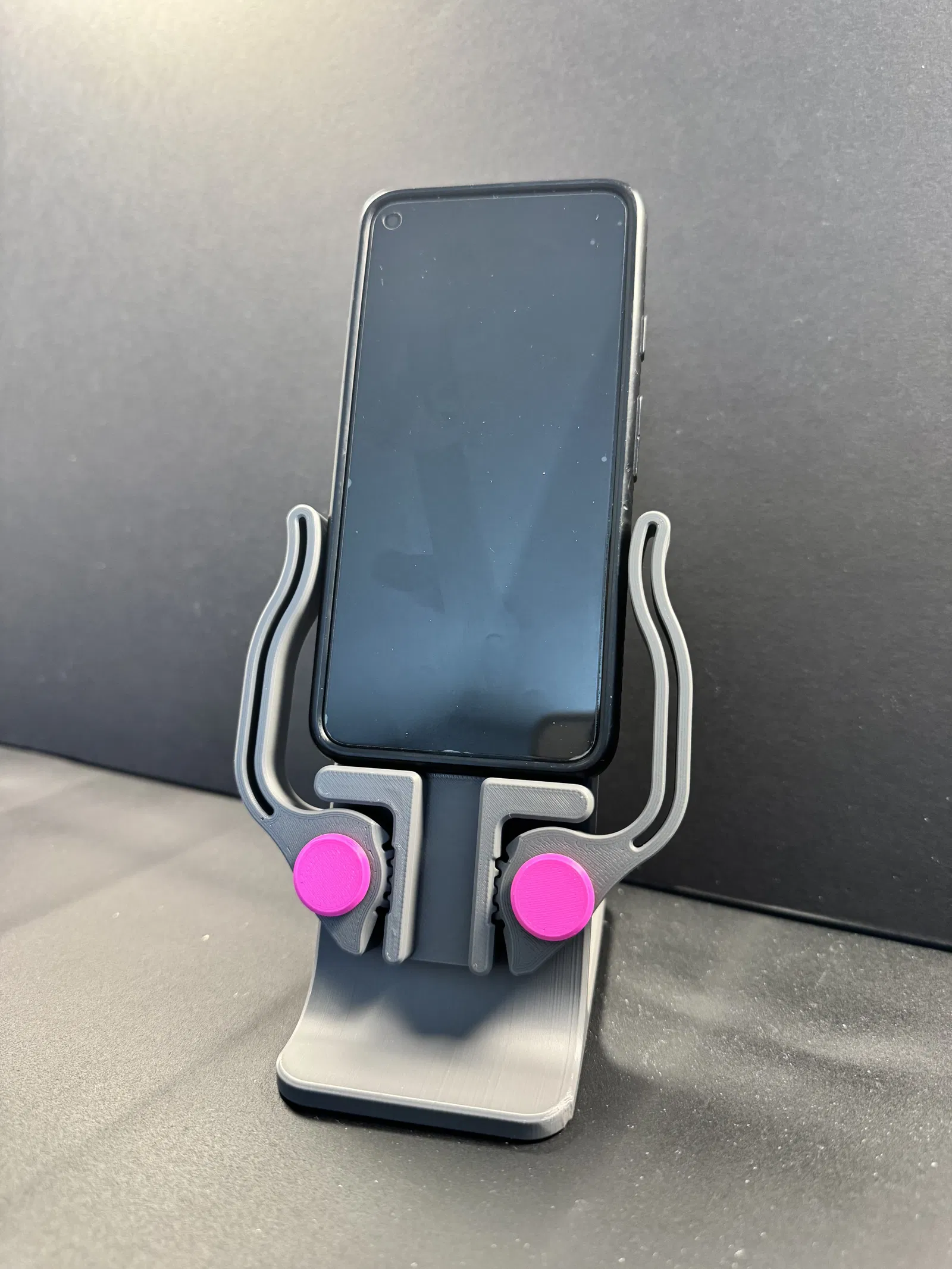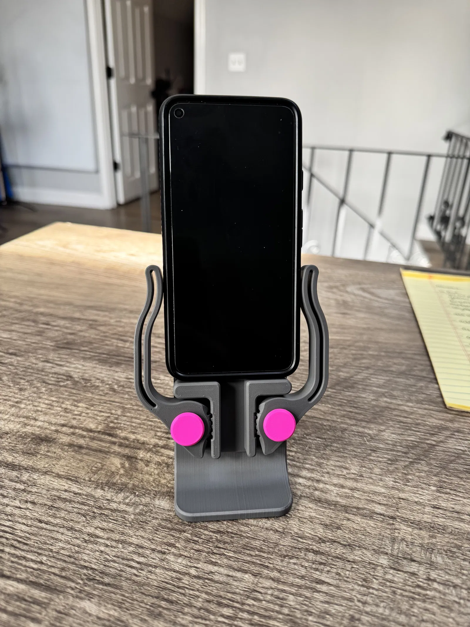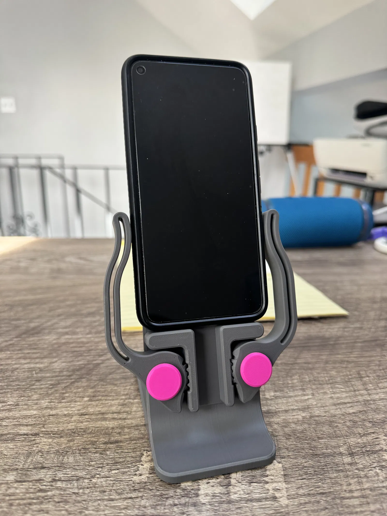 Chân đế điện thoại dùng chính trọng lượng máy để tự kẹp bằng cơ cấu rack & pinion. Chỉ cần đặt xuống là kẹp chặt, nhấc lên là nhả. In FDM với PLA, không cần support, lắp ráp nhanh, hợp nhiều cỡ máy kể cả có ốp và sạc USB-C.