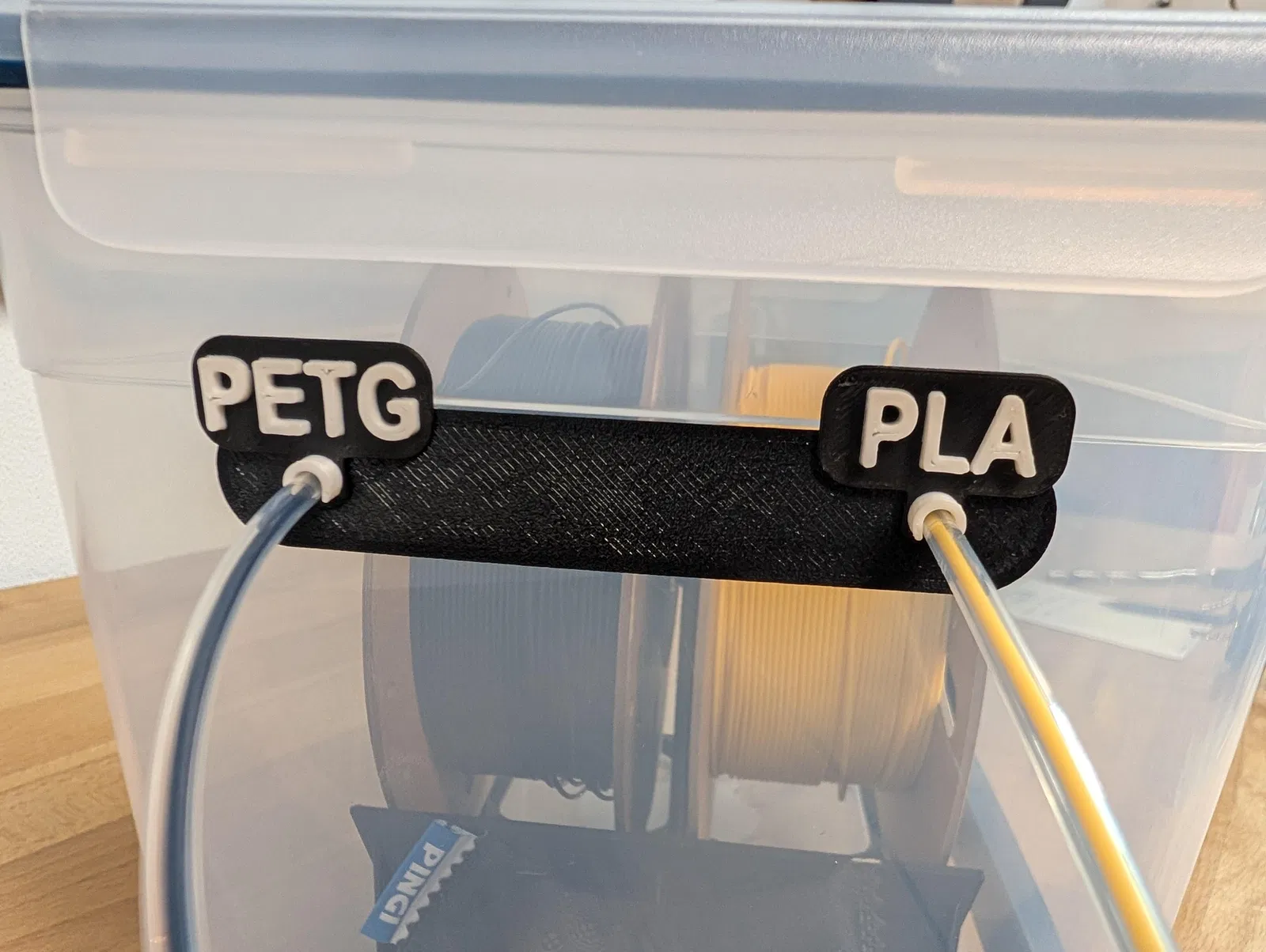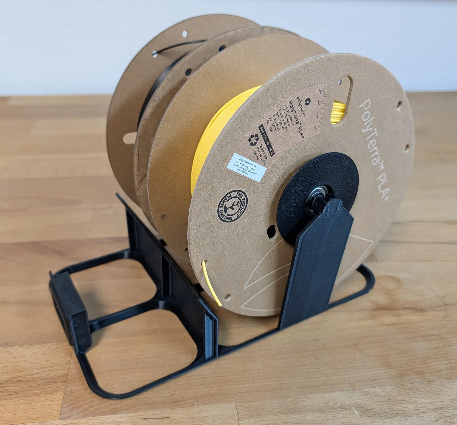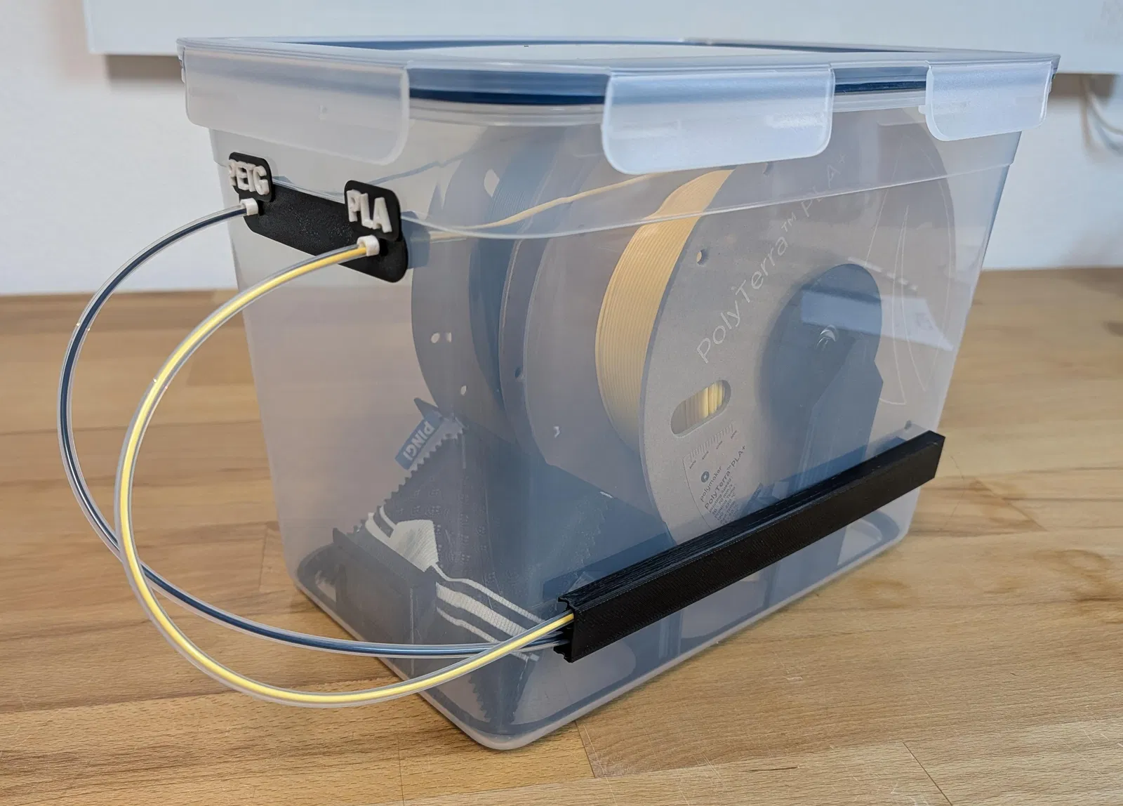 Giá đỡ spool cho IKEA 365+ Drybox: in gần như hoàn toàn, thay spool từng cuộn, chống kẹt, ma sát thấp nhờ vòng bi 608 + trục trung tâm. Có ngăn túi silica, ống dẫn/đỗ PTFE, dùng ít nhựa, bền và ít mòn.