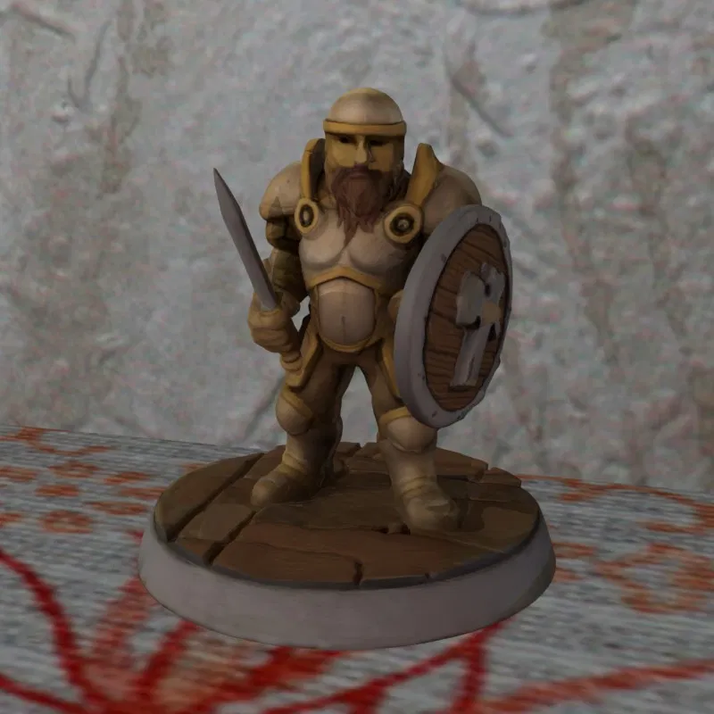 Miniature Dwarven Sentinal in FDM/SLA, support-free, dễ in và dễ sơn để ra mẫu đẹp. Tối ưu layer 0,15; khuyến nghị in Prusament GOLD, điểm SILVER Metallic cho dao/viền khiên/mũ, râu và base sơn nâu.