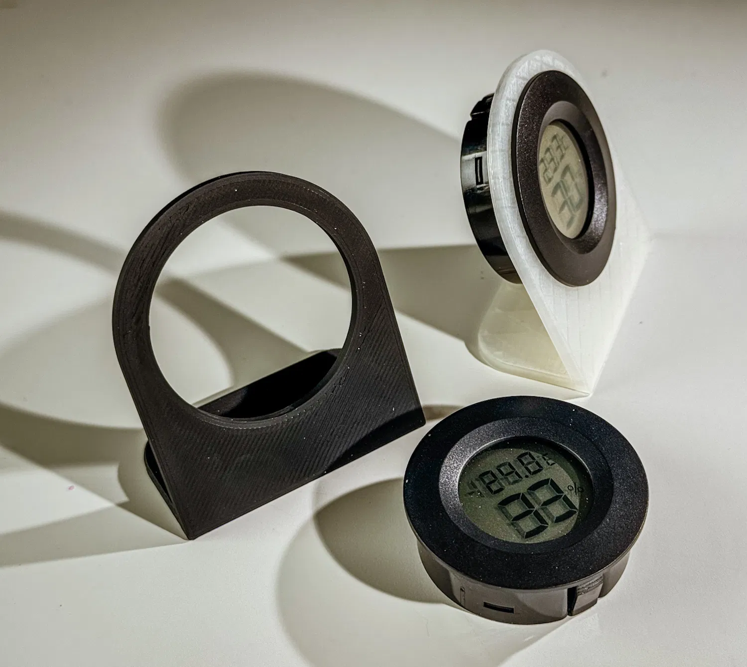 Mẫu Thermometer Stand đơn giản để đặt nhiệt kế/ẩm kế dạng tròn nhỏ, phù hợp loại đường kính 40 mm. In bằng PLA, không cần supports nên dễ in và tiện dùng trên bàn làm việc hoặc trong phòng.