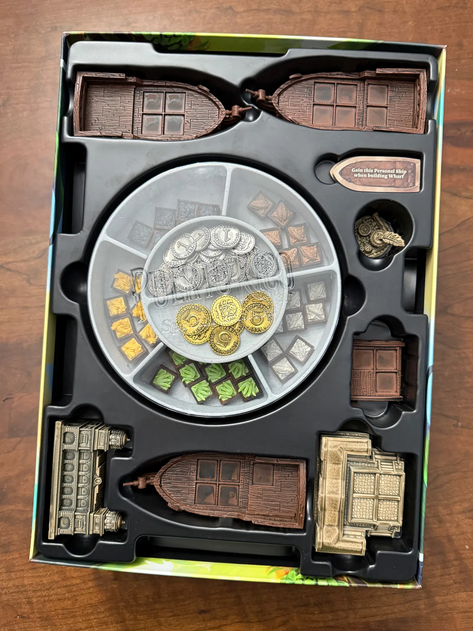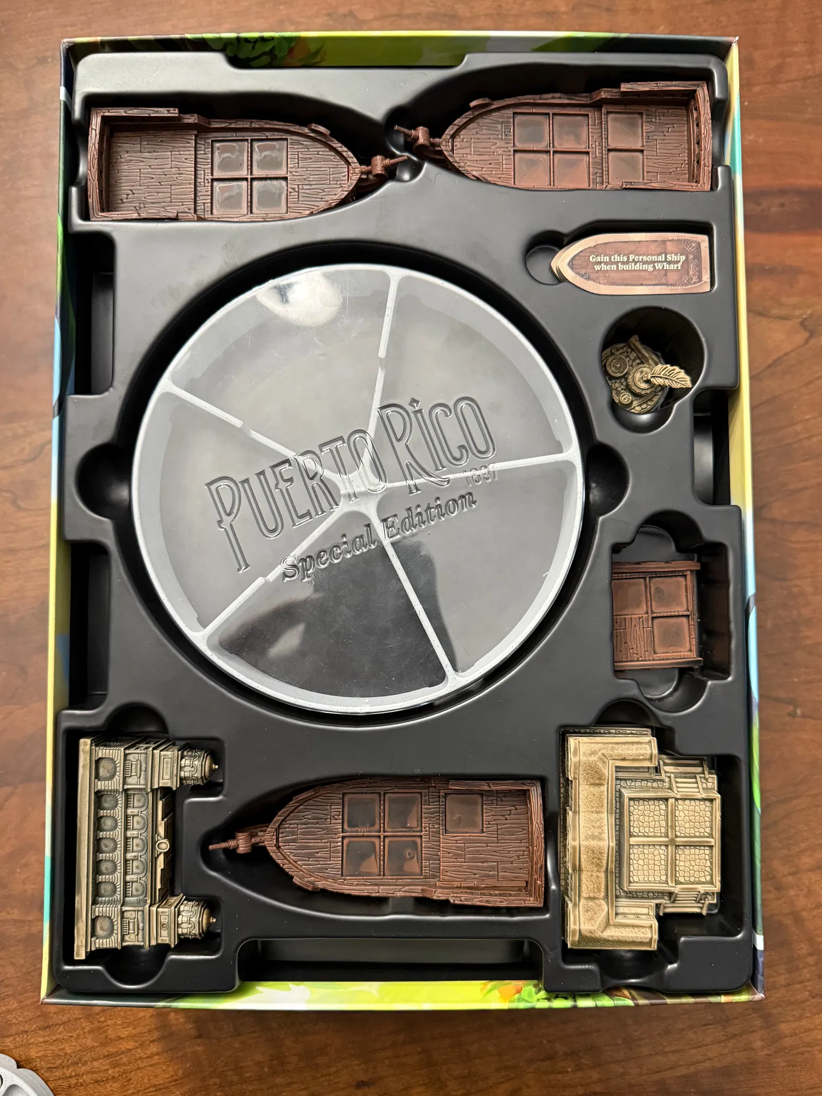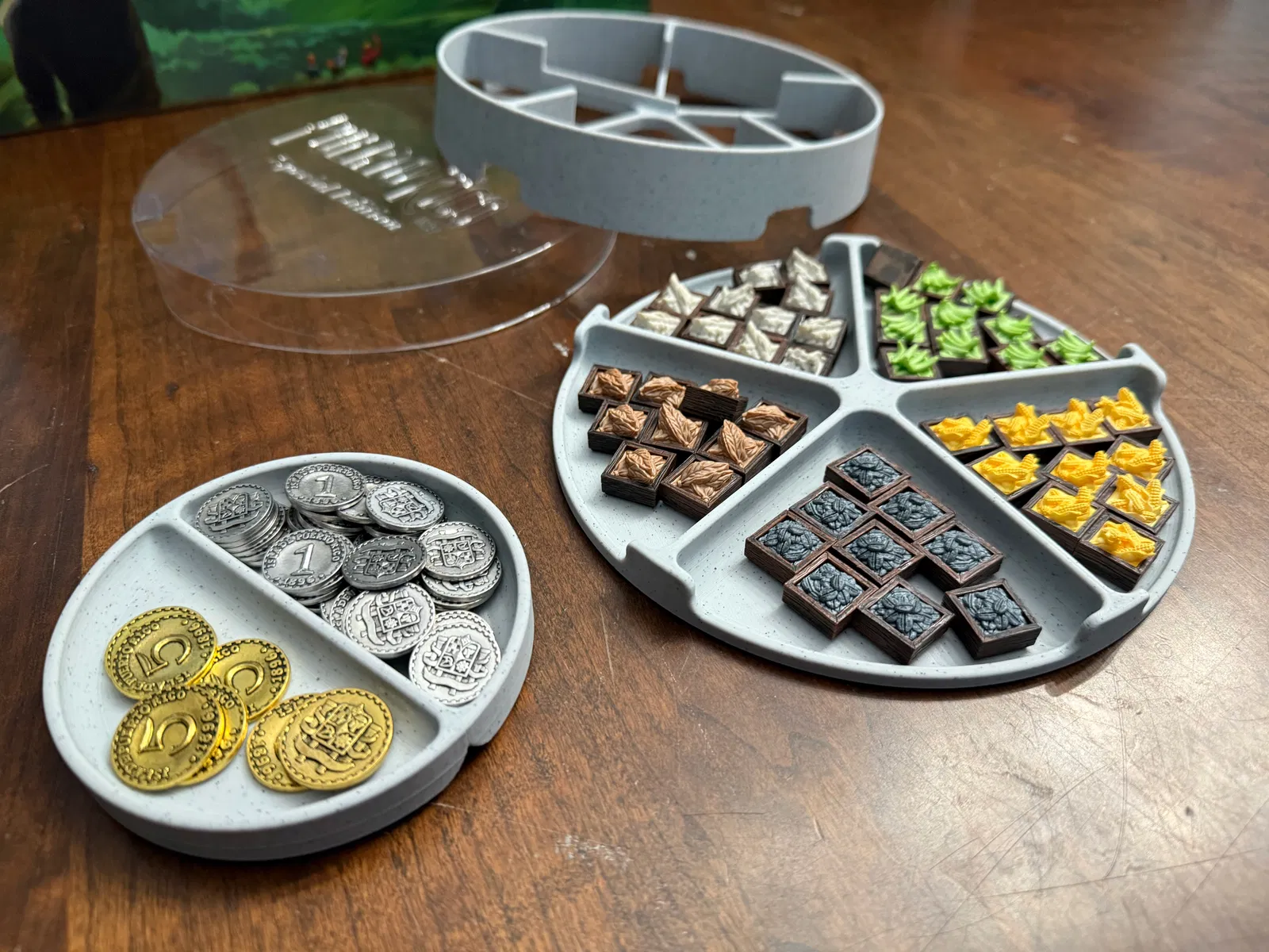 Bộ 3 khay xếp chồng (Coin Tray, Shim, Resource Tray) thay khay vacuum molded zin của Puerto Rico 1897 Special Edition Deluxe. Có bản dùng nam châm (10x3mm + 10x2mm) và bản không, giúp dễ nhìn và lấy tài nguyên hơn.