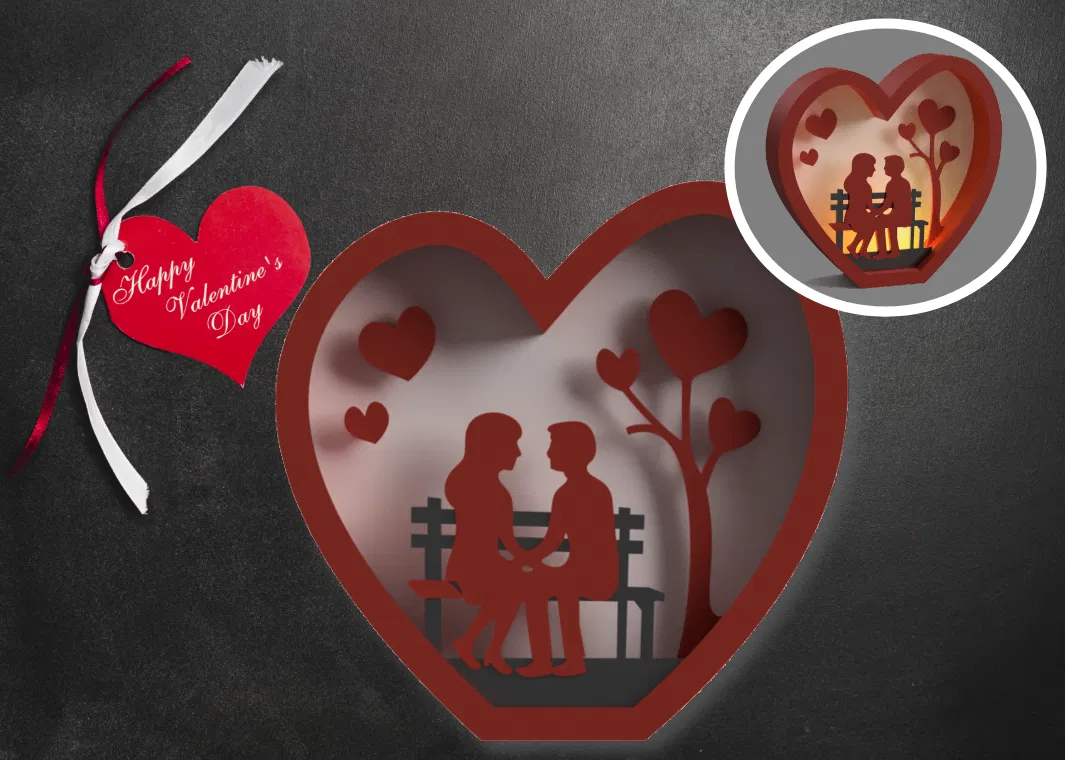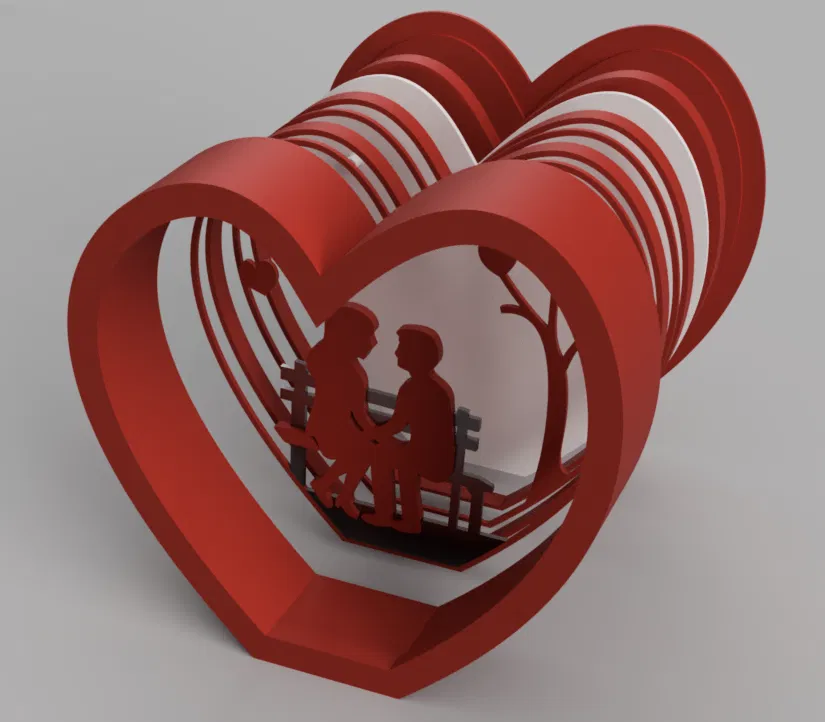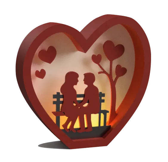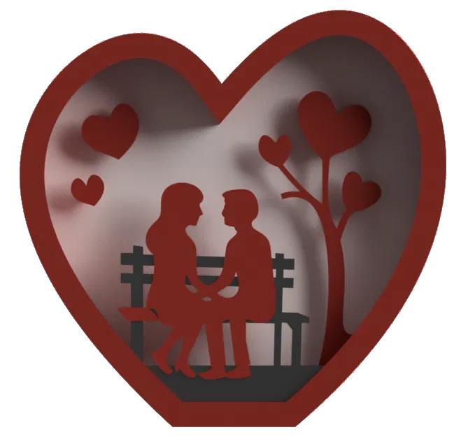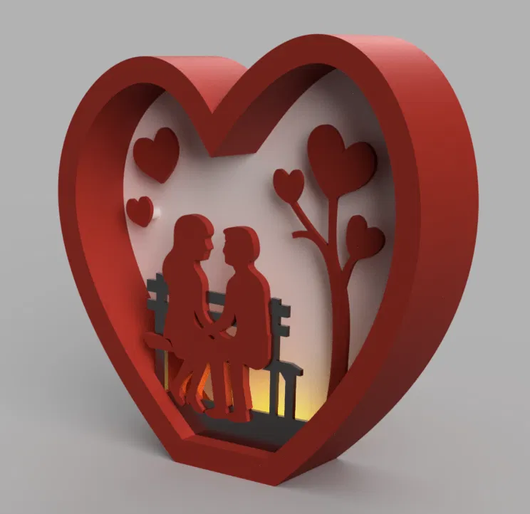 Khung trái tim nhiều lớp dành cho Valentine, có chỗ lắp hệ thống LEDs và đường luồn dây sẵn. Thiết kế gồm các layer cây, cặp đôi trên ghế và trái tim gắn nền; in không cần AMS (đổi màu ở 2mm), không cần support.