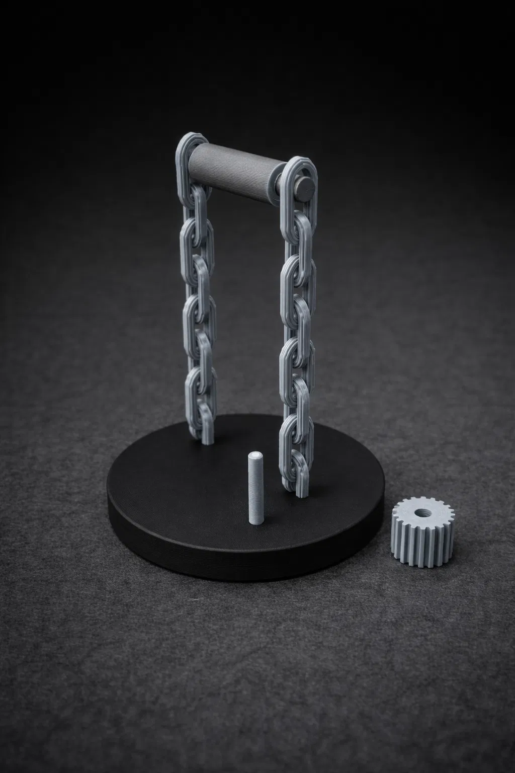 Mẫu giá treo tai nghe in 3D phong cách industrial với chi tiết dây xích và phần đế nặng, cho độ vững tối đa. In FDM bằng PLA/PLA+/PETG, không cần supports, có thể scale mà vẫn giữ độ bền.